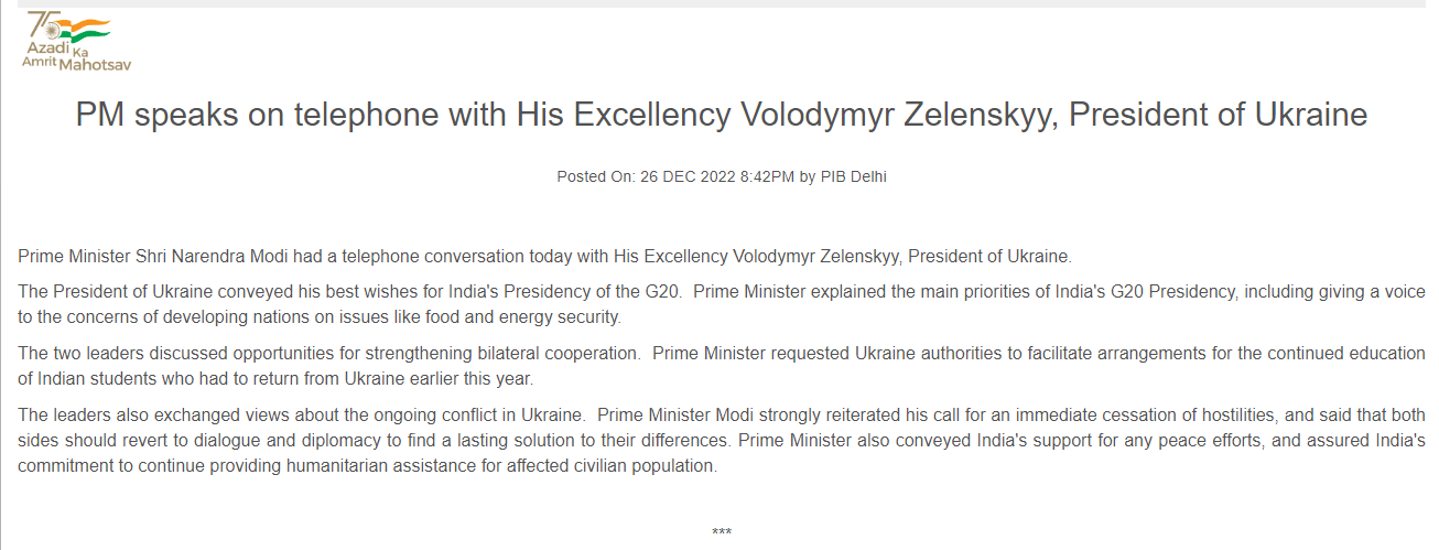 भारत की तरफ से भी मामले में प्रतिक्रिया दी गई। प्रधानमंत्री कार्यालय की ओर से बताया गया कि दोनों नेताओं ने द्विपक्षीय सहयोग को मजबूत करने के अवसरों पर चर्चा की। पीएम ने यूक्रेन के अधिकारियों से भारतीय छात्रों की निरंतर शिक्षा की व्यवस्था करने का अनुरोध किया, जिन्हें इस साल की शुरुआत में यूक्रेन से वापस आना पड़ा था।