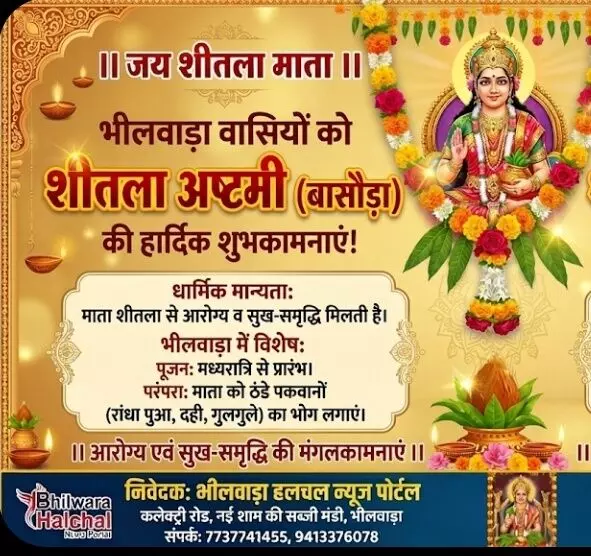 * पूजा का समय: भीलवाड़ा में मंगलवार और बुधवार की मध्यरात्रि से ही महिलाएं शीतला माता के मंदिरों में जाकर ठंडे पकवानों का भोग लगाना शुरू करेंगी।