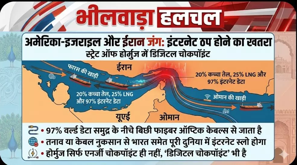भीलवाड़ा/डेस्क। खाड़ी देशों में बढ़ता सैन्य तनाव अब केवल कच्चे तेल की कीमतों तक सीमित नहीं रहने वाला है। अमेरिका-इजराइल और ईरान के बीच युद्ध की परिस्थितियों के चलते 'स्ट्रेट ऑफ होर्मुज' (Hormuz Strait) के प्रभावित होने से अब वैश्विक स्तर पर इंटरनेट ब्लैकआउट का बड़ा खतरा खड़ा हो गया है। विशेषज्ञों की मानें तो यह समुद्री मार्ग न केवल ऊर्जा आपूर्ति का मुख्य केंद्र है, बल्कि दुनिया की डिजिटल लाइफलाइन भी है।
