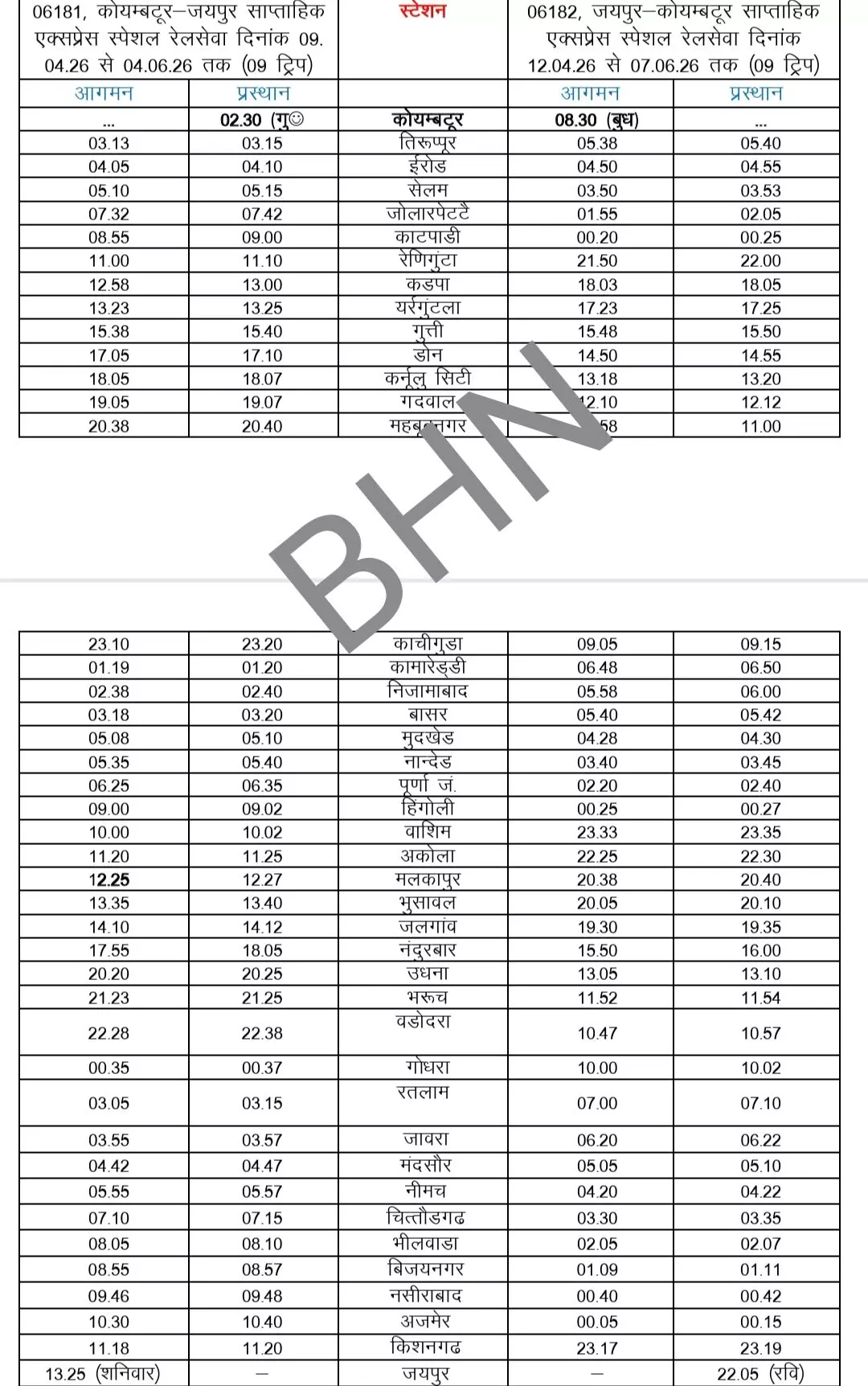 गाड़ी संख्या 06181 (कोयम्बटूर से जयपुर): 09 अप्रैल 26 से 04 जून .26 तक प्रत्येक गुरुवार को कोयम्बटूर से दोपहर 02:30 बजे रवाना होकर शनिवार को 13:25 बजे जयपुर पहुँचेगी।