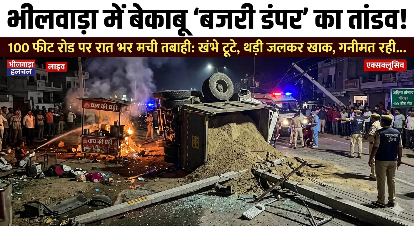 बजरी डंपर का खौफनाक तांडव: 100 फीट रोड पर रात भर मचा हड़कंप, बिजली खंभे तोड़े, थड़ी जलकर राख