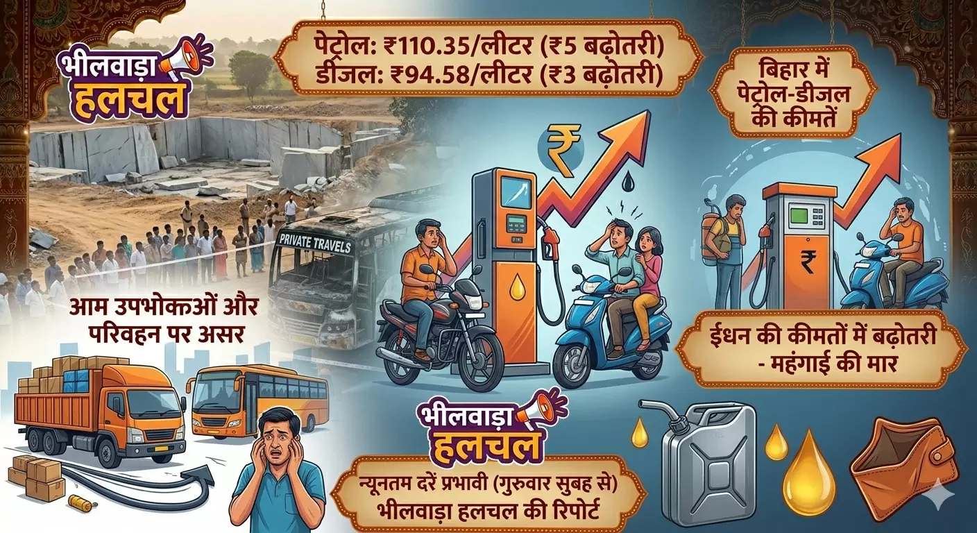 पटना | बिहार में आम आदमी की जेब पर महंगाई की एक और मार पड़ी है। पेट्रोलियम कंपनियों द्वारा ईंधन की कीमतों में की गई ताजा बढ़ोतरी के बाद राज्य भर में पेट्रोल और डीजल के दाम आसमान छूने लगे हैं। गुरुवार सुबह से लागू हुई नई दरों के अनुसार, पेट्रोल की कीमतों में ₹5 और डीजल में ₹3 प्रति लीटर का भारी इजाफा किया गया है।