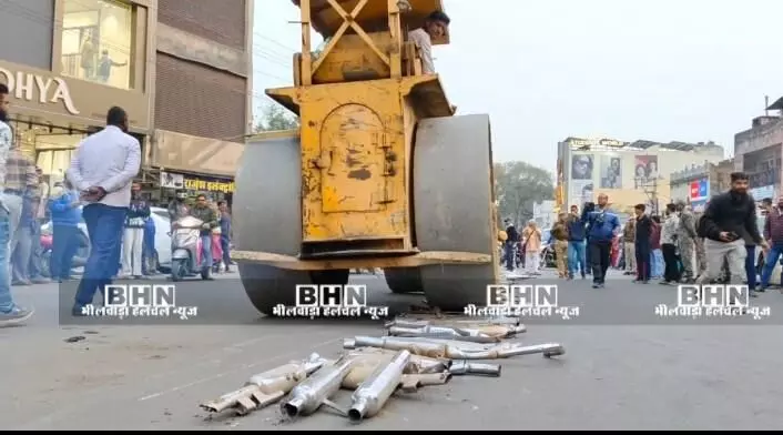 भीलवाड़ा बीएचएन। भीलवाड़ा पुलिस ने अवैध रूप से मॉडिफाइड बुलेट बाइक के साइलेंसरों पर बुलडोजर चलाकर उन्हें नष्ट कर दिया है। पटाखे जैसी आवाज कर ध्वनि प्रदूषण फैलाने और स्टंटबाजी के खिलाफ यह सख्त कार्रवाई की गई, जिसके तहत तकरीबन 150 साइलेंसर जब्त कर बुलडोजर से कुचल दिए गए। इस दौरान कार्रवाई को देखने मौके पर लोगों की भीड़ जुटी रही।