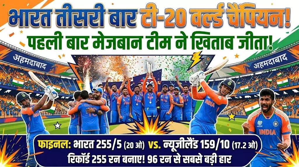 नई दिल्ली/अहमदाबाद। भारतीय पुरुष क्रिकेट टीम ने रविवार को इतिहास रचते हुए न्यूजीलैंड को हराकर तीसरी बार टी-20 वर्ल्ड कप का खिताब अपने नाम कर लिया है। अहमदाबाद के खचाखच भरे नरेंद्र मोदी स्टेडियम में खेले गए इस ऐतिहासिक फाइनल मुकाबले में टीम इंडिया ने कीवियों को 96 रनों से रौंदकर ट्राफी उठाई। इस यादगार जीत के साथ ही भारत तीन बार यह खिताब जीतने वाली दुनिया की पहली टीम बन गई है, और लगातार दो बार (2024 और 2026) टाइटल डिफेंड करने वाला भी पहला देश।