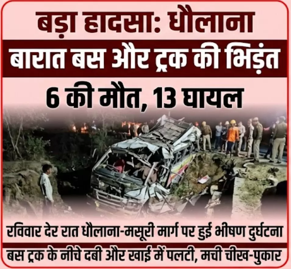 ट्रक और बारातियों से भरी बस में जबरदस्त भिड़ंत, 6 की मौत, 13 घायल,धौलाना-मसूरी मार्ग पर भीषण हादसा