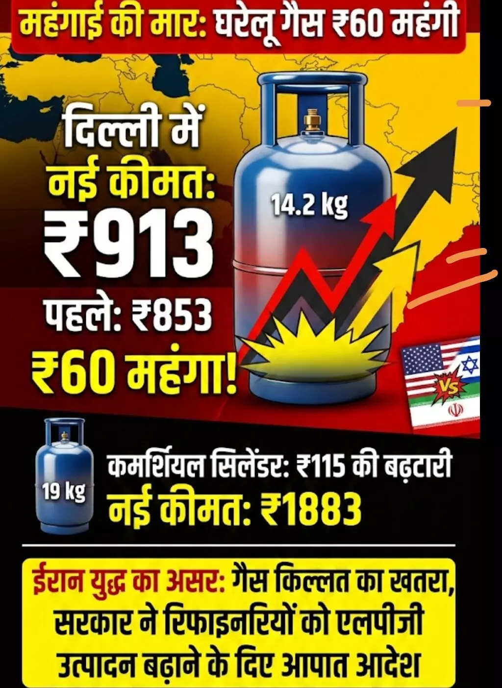 नई दिल्ली | अमेरिका, इजराइल और ईरान के बीच बढ़ते युद्ध के तनाव का असर अब सीधे भारतीय रसोई पर पड़ने लगा है। केंद्र सरकार ने घरेलू एलपीजी (LPG) गैस सिलेंडर के दामों में ₹60 की भारी बढ़ोतरी कर दी है। इस फैसले के बाद दिल्ली में 14.2 किलोग्राम वाला घरेलू सिलेंडर अब ₹913 में मिलेगा, जो पहले ₹853 का था।