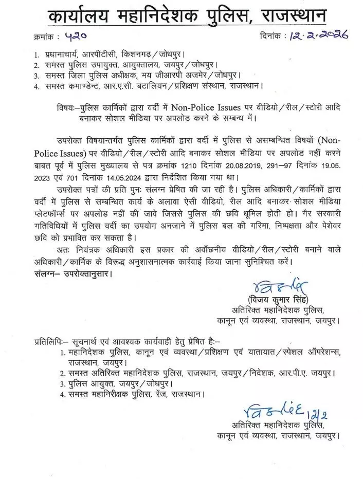 भीलवाड़ा BHN। राजस्थान पुलिस मुख्यालय ने पुलिसकर्मियों को साफ चेतावनी दे दी है—अब वर्दी में “नॉन-पुलिस इश्यू” पर वीडियो, रील या स्टोरी बनाकर सोशल मीडिया पर डालना भारी पड़ेगा। ऐसा करने वालों पर सीधी अनुशासनात्मक कार्रवाई होगी।