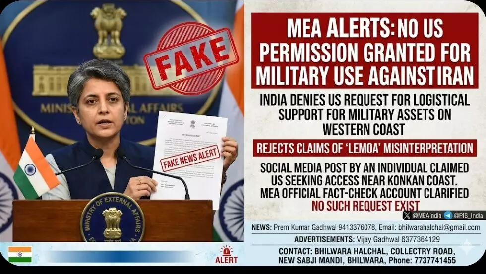 नई दिल्ली। सोशल मीडिया पर पिछले कुछ दिनों से वायरल हो रहे एक सनसनीखेज दावे को भारत के विदेश मंत्रालय (MEA) ने सिरे से खारिज कर दिया है। वायरल पोस्ट में दावा किया गया था कि अमेरिका ने ईरान के खिलाफ सैन्य अभियान चलाने के लिए भारत से उसकी जमीन और सैन्य संसाधनों के इस्तेमाल की अनुमति मांगी है। विदेश मंत्रालय ने इसे 'फेक न्यूज' करार देते हुए आम जनता को सतर्क रहने की सलाह दी है।