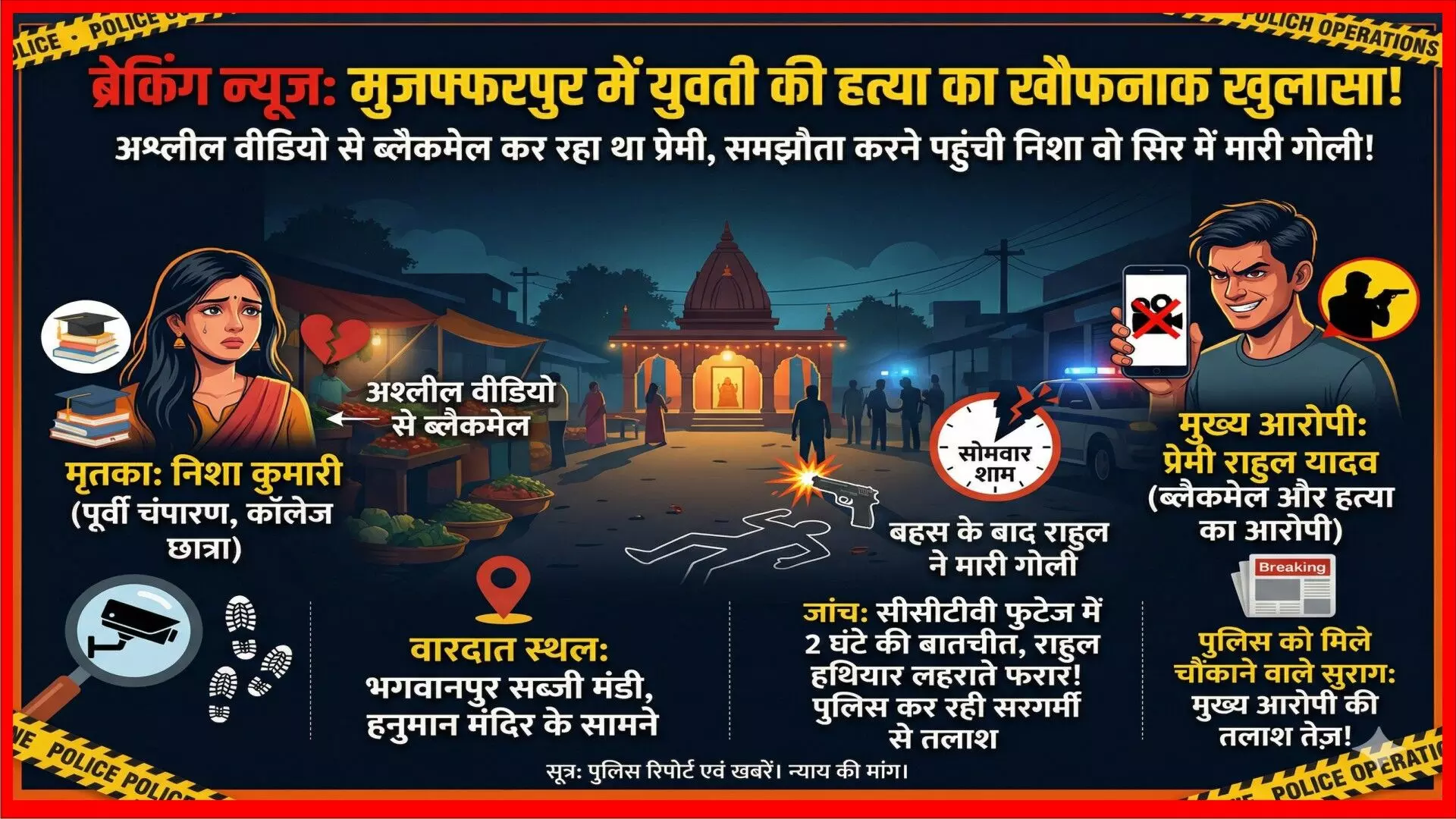 मृतका निशा कुमारी मूल रूप से पूर्वी चंपारण की रहने वाली थी और मुजफ्फरपुर में रहकर पढ़ाई कर रही थी। आरोपी राहुल और निशा एक ही कॉलेज में पढ़ते थे, जहाँ उनकी दोस्ती प्रेम संबंध में बदल गई थी। आरोप है कि राहुल ने निशा का आपत्तिजनक वीडियो बना लिया था और उसे वायरल करने की धमकी देकर लगातार प्रताड़ित कर रहा था। सोमवार को निशा इसी विवाद को सुलझाने मंदिर पहुंची थी, जहाँ सीसीटीवी फुटेज के अनुसार दोनों के बीच करीब दो घंटे तक बातचीत हुई। बहस बढ़ने पर राहुल ने अचानक पिस्तौल निकाली और वारदात को अंजाम देकर हथियार लहराते हुए फरार हो गया। पुलिस ने सीसीटीवी फुटेज और अन्य साक्ष्यों के आधार पर आरोपी की तलाश तेज कर दी है।