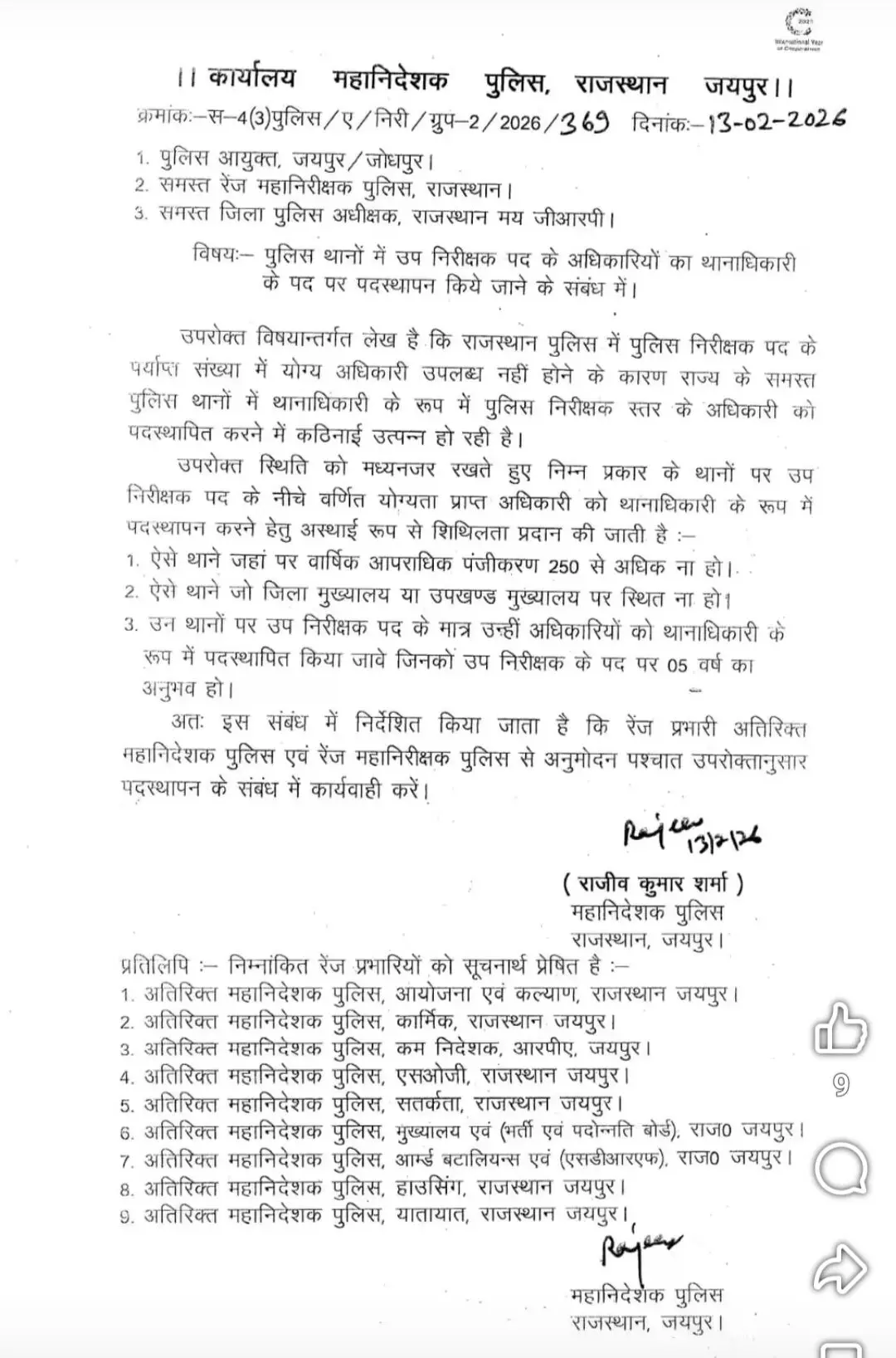 13 फरवरी 2026 को जारी आदेश में राजीव कुमार शर्मा, महानिदेशक पुलिस राजस्थान ने साफ कहा है कि राज्य में पुलिस निरीक्षक (Inspector) स्तर के अधिकारियों की कमी के चलते सभी थानों पर इंस्पेक्टर को थानाधिकारी बनाना संभव नहीं हो पा रहा।