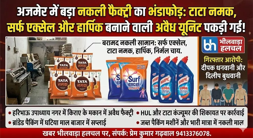 अजमेर | अजमेर की हरिभाऊ उपाध्याय नगर थाना पुलिस ने ट्रेड मार्क एक्ट के तहत एक बड़ी कार्रवाई को अंजाम देते हुए नामी कंपनियों के नाम पर नकली उत्पाद बेचने वाले गिरोह का पर्दाफाश किया है। पुलिस ने एक किराए के मकान में चल रही अवैध पैकिंग फैक्ट्री पर छापा मारकर दो मुख्य आरोपियों को गिरफ्तार किया है, जो ब्रांडेड पैकिंग का सहारा लेकर घटिया माल बाजार में खपा रहे थे।