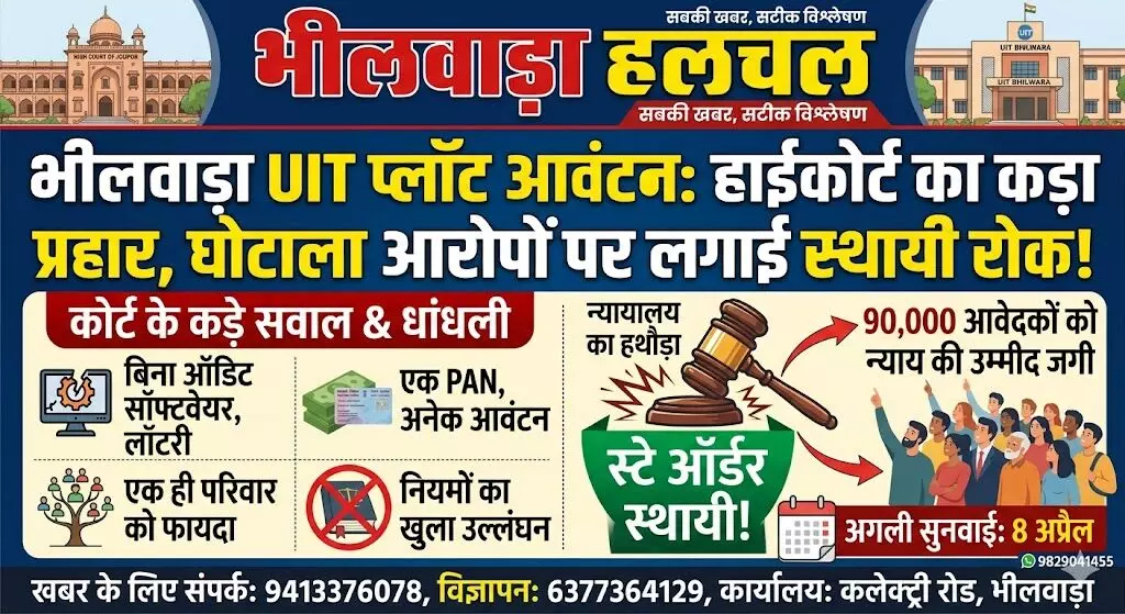 भीलवाड़ा/जोधपुर। भीलवाड़ा नगर विकास न्यास (UIT) की विवादित प्लॉट आवंटन लॉटरी प्रक्रिया पर राजस्थान हाईकोर्ट ने अपना शिकंजा और कस दिया है। जोधपुर हाईकोर्ट ने इस मामले में कड़ा रुख अपनाते हुए 11 नवंबर 2025 को जारी अंतरिम रोक (स्टे) के आदेश को अब स्थायी कर दिया है। अदालत के इस फैसले से साफ है कि धांधली के आरोपों से घिरी इस आवंटन प्रक्रिया पर रोक बदस्तूर जारी रहेगी।
