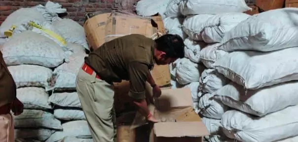 पटाखा निर्माण में प्रयुक्त पोटेशियम नाइट्रेट, सल्फर, चारकोल पाउडर, एल्युमिनियम पाउडर, नीला थोथा, मिश्रित विस्फोटक पदार्थ और फॉस्फेट के कट्टे भी बरामद हुए, जिनका कुल वजन लगभग 12 क्विंटल है। इसके अतिरिक्त करीब 130 बोरी जर्दा, जिनका वजन लगभग 45 क्विंटल है, भी गोदामों से मिला। पटाखों में प्रयुक्त होने वाली लाल बत्ती के 20 बंडल, पैकिंग मशीन, विभिन्न लेबल और पैकिंग सामग्री भी जब्त की गई।