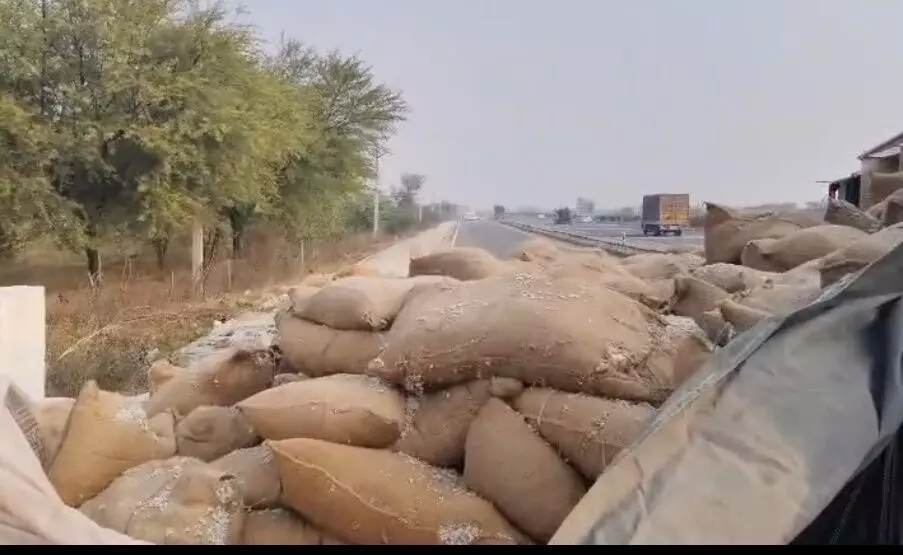 नीलगाय को बचाने में हाईवे पर पलटा कपासिया खली से भरा ट्रक, बड़ा हादसा टला