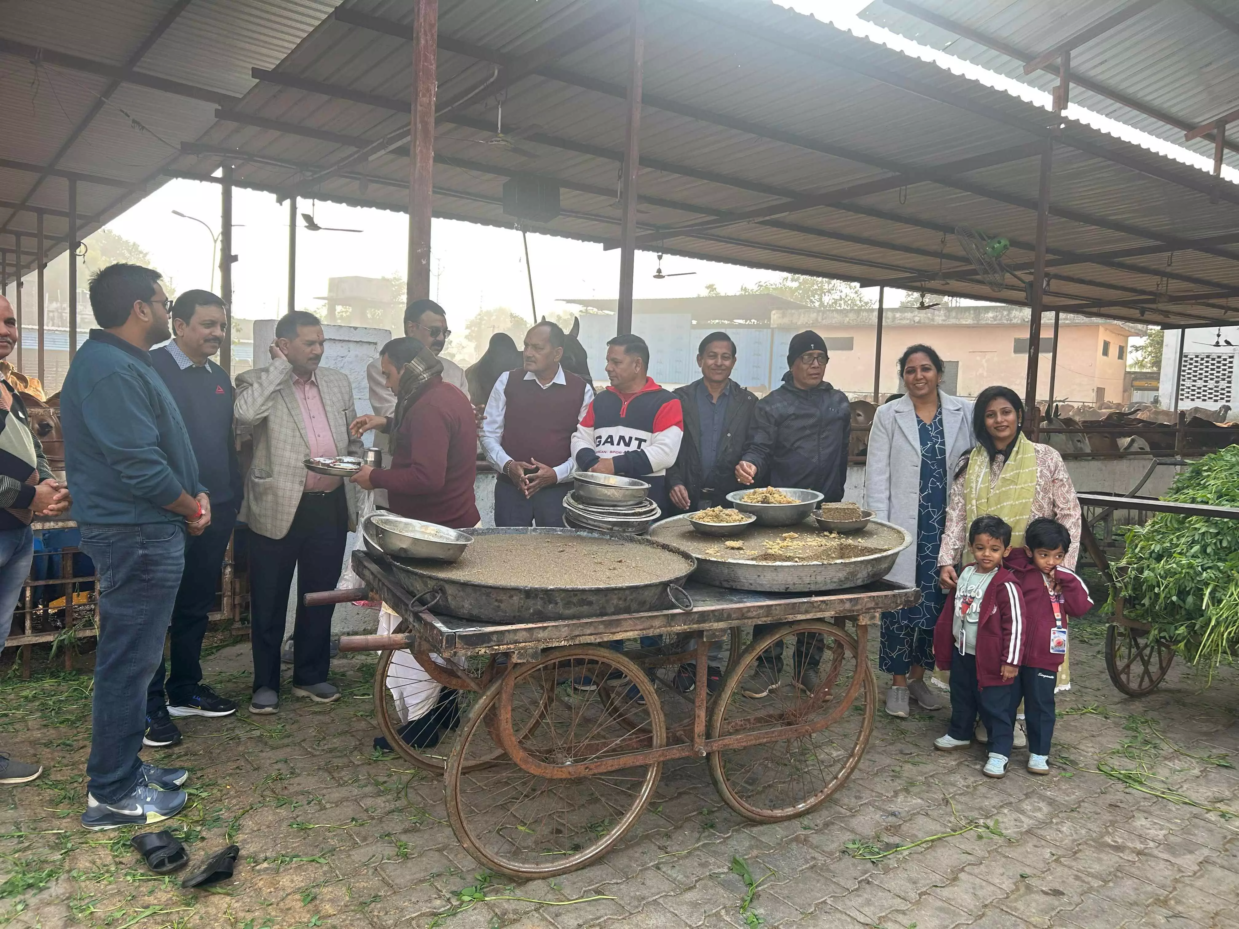 भीलवाड़ा। (पंकज पोरवाल) लांयस इंटरनेशनल डिस्ट्रीक 3233 म् 2 के गर्वनर के प्राईम प्रोगाम जीव दया के तहत लायंस क्लब भीलवाड़ा सीटी के द्वारा रामधाम गोशाला में गो सेवा कार्य किया गया। साथ ही गौमाता को लापसी का भोग लगाकर वितरण किया गया। लायंस क्लब भीलावाडा सीटी के अध्यक्ष अतुल राठी ने बताया कि आज रामधाम गौ शाला पर लायन सुरेश बिड़ला व परिवार जनो के सहयोग द्वारा गायों को 1 किवंटल हरा चारा व 1 किवंटल लापसी गो माता को खिलाई गई है। इस अवसर पर लायन सुरेश बिड़ला कहा कि “मूक पशु-पक्षियों की सेवा सच्चे अर्थों में ईश्वर की सेवा है। ऐसे सेवा कार्य समाज में करुणा, सहअस्तित्व एवं नैतिक मूल्यों को मजबूत करते हैं। सेवाकार्य में लायन संजय काबरा, रेखा काबरा, पकंज दिक्षा बिड़ला लायन संदीप कोगटा, लायन कमलेश शाह, लायन भानु जैन, लायन गजानन्द बजाज, लायन कमल मोदी, लायन विनोद कुसुम गट्टाणी व लायन नन्दकिशोर दरक ने सहभागिता निभाई। सभी ने उत्साहपूर्वक सहभागिता निभाते हुए जीव-जंतुओं की सेवा का संकल्प लिया। अंत मे क्लब सचिव लायंन दिनेश सोनी ने सभी लायन साथियों का आभार प्रकट किया।