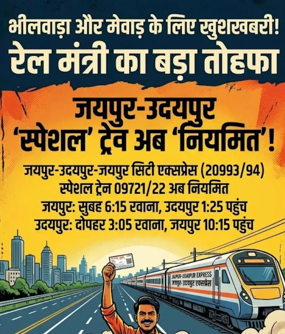 भीलवाड़ा को रेल मंत्री का बड़ा तोहफा: जयपुर-उदयपुर स्पेशल ट्रेन अब होगी नियमित, यात्रियों की राह हुई आसान