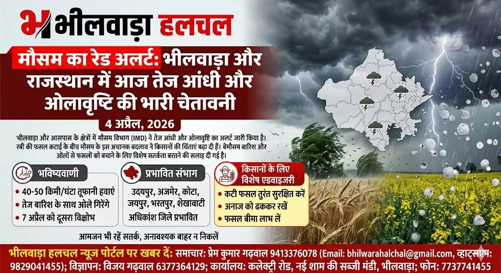 भीलवाड़ा/जयपुर। पश्चिमी विक्षोभ के सक्रिय होने से राजस्थान में मौसम ने अचानक करवट ली है। भारत मौसम विज्ञान विभाग (IMD) ने आज (4 अप्रैल) को भीलवाड़ा सहित प्रदेश के अधिकांश जिलों में 40-50 किलोमीटर प्रति घंटे की रफ्तार से तेज आंधी, बारिश और ओलावृष्टि का अलर्ट जारी किया है। बेमौसम बारिश के इस अलर्ट ने रबी की फसल काट रहे किसानों की माथे पर चिंता की लकीरें खींच दी हैं।