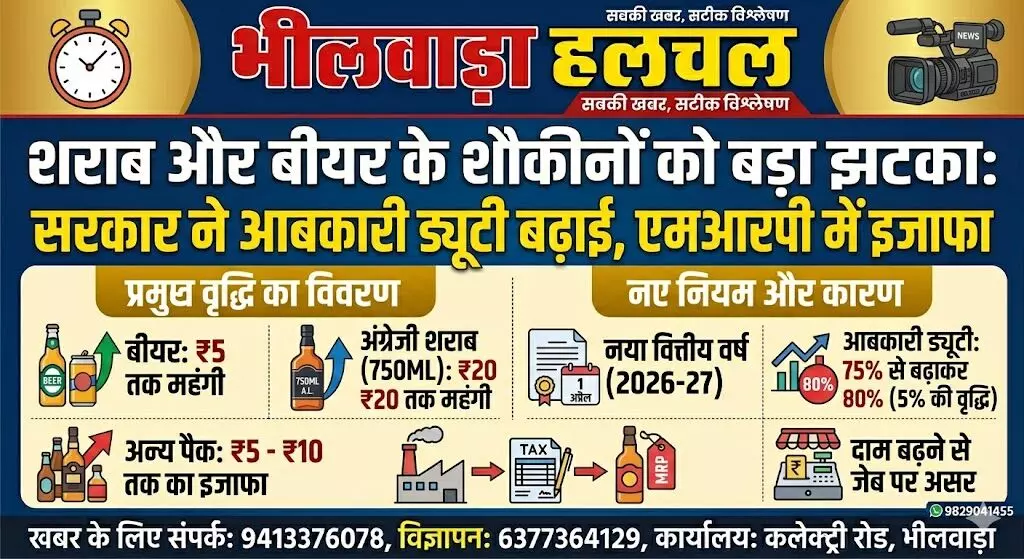 भीलवाड़ा। नए वित्तीय वर्ष (2026-27) की शुरुआत शराब और बीयर के शौकीनों के लिए जेब ढीली करने वाली साबित होगी। सरकार द्वारा आबकारी ड्यूटी में इजाफा किए जाने के बाद 1 अप्रैल से मदिरा प्रेमियों को अपनी पसंदीदा बोतल के लिए अधिक कीमत चुकानी होगी।