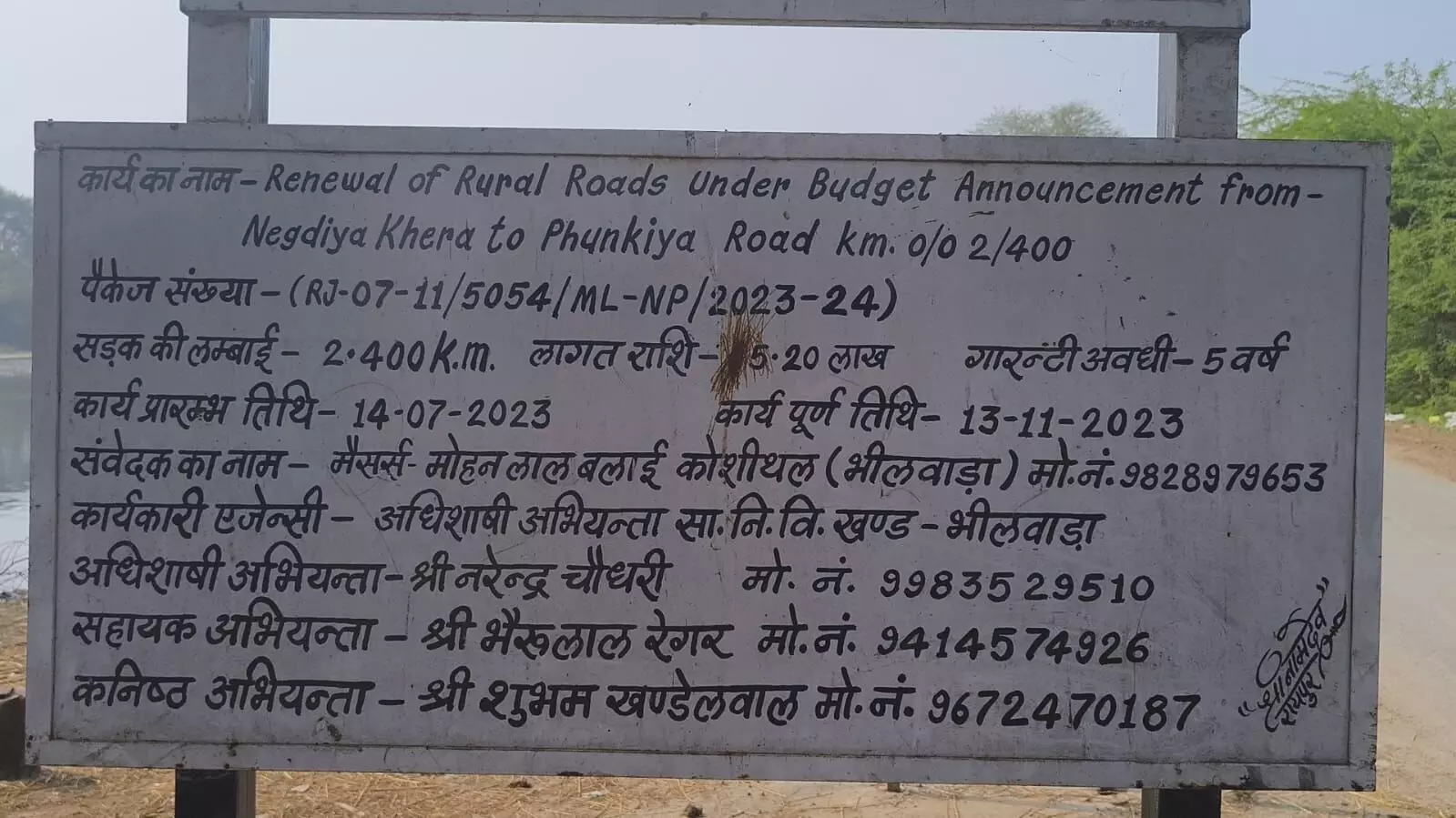 भीलवाड़ा । जिले की अंतिम सीमा पर स्थित नेगड़िया खेड़ा से फुकिया स्कूल तक बनी डामर सड़क निर्माण की गुणवत्ता पर गंभीर सवालिया निशान खड़े हो गए हैं। भ्रष्टाचार और लापरवाही का आलम यह है कि 5 वर्ष की गारंटी अवधि वाली यह सड़क महज दो साल के भीतर ही पूरी तरह खड्डों में तब्दील हो चुकी है।
