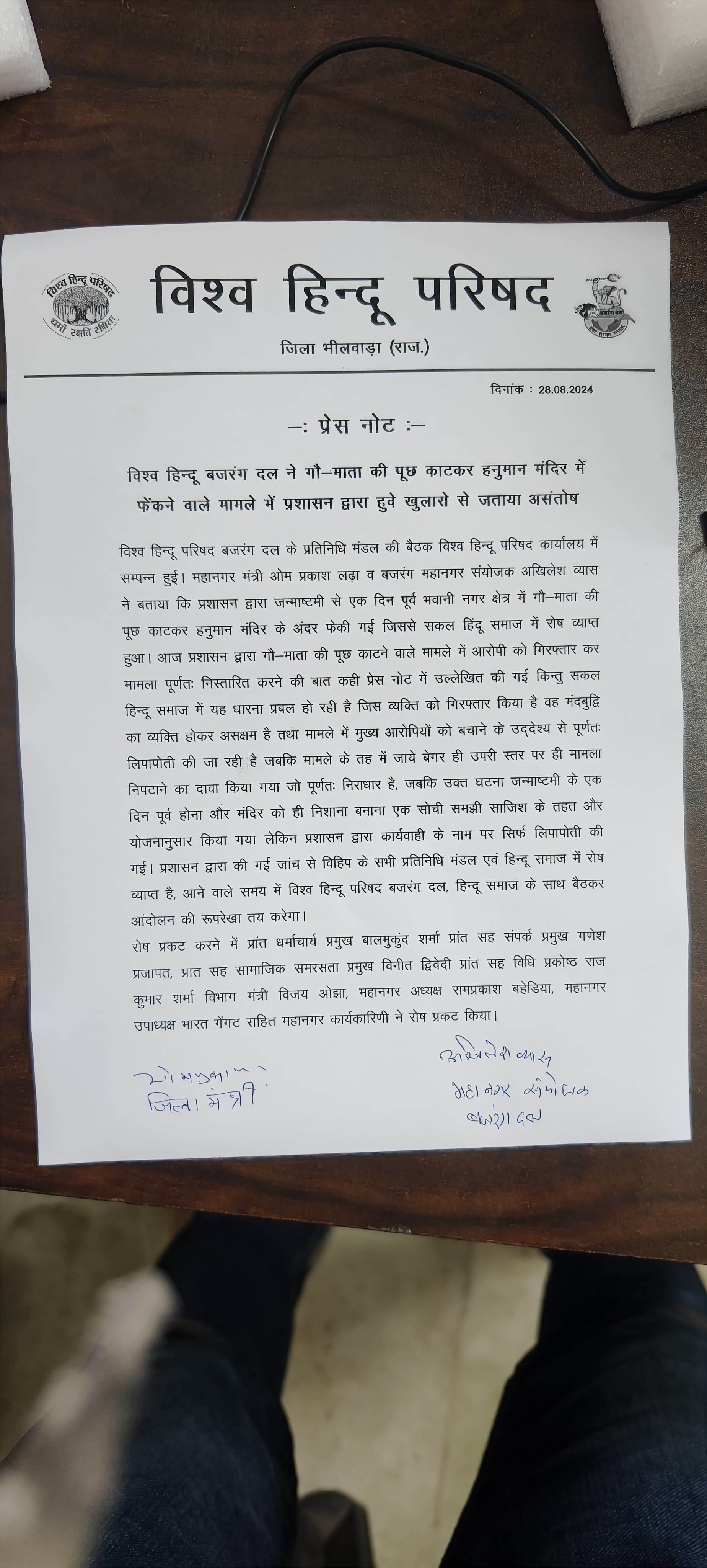 विश्व हिन्दू परिषद बजरंग दल के प्रतिनिधि मंडल की बैठक विश्व हिन्दू परिषद कार्यालय में सम्पन्न हुई। महानगर मंत्री ओम प्रकाश लढ़ा व बजरंग महानगर संयोजक अखिलेश व्यास ने बताया कि प्रशासन द्वारा जन्माष्टमी से एक दिन पूर्व भवानी नगर क्षेत्र में गौ-माता की पूछ काटकर हनुमान मंदिर के अंदर फेकी गई जिससे सकल हिंदू समाज में रोष व्याप्त हुआ। आज प्रशासन द्वारा गौ-माता की पूछ काटने वाले मामले में आरोपी को गिरफ्तार कर मामला पूर्णतः निस्तारित करने की बात कही प्रेस नोट में उल्लेखित की गई किन्तु सकल हिन्दू समाज में यह धारना प्रबल हो रही है जिस व्यक्ति को गिरफ्तार किया है वह मंदबुद्वि का व्यक्ति होकर असक्षम है तथा मामले में मुख्य आरोपियों को बचाने के उद्देश्य से पूर्णतः लिपापोती की जा रही है जबकि मामले के तह में जाये बेगर ही उपरी स्तर पर ही मामला निपटाने का दावा किया गया जो पूर्णतः निराधार है, जबकि उक्त घटना जन्माष्टमी के एक दिन पूर्व होना और मंदिर को ही निशाना बनाना एक सोची समझी साजिश के तहत और योजनानुसार किया गया लेकिन प्रशासन द्वारा कार्यवाही के नाम पर सिर्फ लिपापोती की गई। प्रशासन द्वारा की गई जांच से विहिप के सभी प्रतिनिधि मंडल एवं हिन्दू समाज में रोष व्याप्त है, आने वाले समय में विश्व हिन्दू परिषद बजरंग दल, हिन्दू समाज के साथ बैठकर आंदोलन की रूपरेखा तय करेगा।