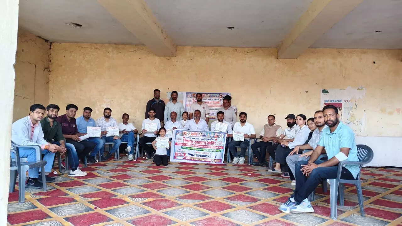 गेंदलिया (एस शर्मा) । -क्षेत्र के निकटवर्ती आमा ग्राम पंचायत मुख्यालय पर विशाल रक्तदान शिविर का दीप प्रज्वलित कर रक्तदान का शुभारंभ किया । कार्यकर्ता नंद लाल तेली ने बताया कि शिविर कुल 73 यूनिट रक्तदान हुआ ।जिसमें 21 रक्तदाताओ ने प्रथम बार रक्तदान किया । झुंझुनू से आये अशोक शर्मा ने 22 वी बार ,दीनबंधु पाराशर 21 वी बार, शिव व्यास रेणवास ने 15 वी बार, भेरू नोरिया ने 13 वी बार , उपसरपंच संजय पांडिया ने 11 वी बार ,रामप्रसाद वैष्णव ने 10 वी बार , विशाल पाराशर ने 8 वी बार रक्तदान किया । शिविर में दुर्लभ समूह के 7 रक्तदाताओं ने रक्तदान किया ।शिविर में कार्यकर्ताओं ने भारत माता की जय , इंकलाब जिंदाबाद , रक्तदान - महादान जैसे नारे लगाकर रक्तदाताओं का हौसला बढ़ाया ।सहयोगकर्ता रामप्रसाद वैष्णव, संजय पांडिया,भेरू नोरिया, शिव व्यास, महेंद्र सुवालका, विशाल पाराशर ,ललित शर्मा गेंदलिया , विनोद पंडित ,पप्पू वैष्णव ,प्रकाश शर्मा जीत्या , पप्पू जाट , दीपक पांडे फलौदी एवं अन्य कार्यकर्ताओं ने सहयोग किया । शिविर में रामचंद्र पुरोहित, कैलाश टेलर , भंवर गुर्जर , कन्हैया लाल रेगर ,शिव पालड़िया , नवीन जोशी ,, राज राजेश्वर गाडरी उपस्थित रहे । पंचायत आमा में सहयोग सेवार्थ फाउंडेशन के नेतृत्व में वीर शहीदो की याद में रक्तदान शिविर का आयोजन किया जिसमें सभी क्षेत्र वासियो ने बढ़ चढ़कर भाग लिया । शिविर में आमा , रेनवास , मुरलिया , गेंदलिया , जीत्या , बड़लियास और आसपास के क्षेत्र से लोगो ने बढ़चढ़कर हिस्सा लिया ।