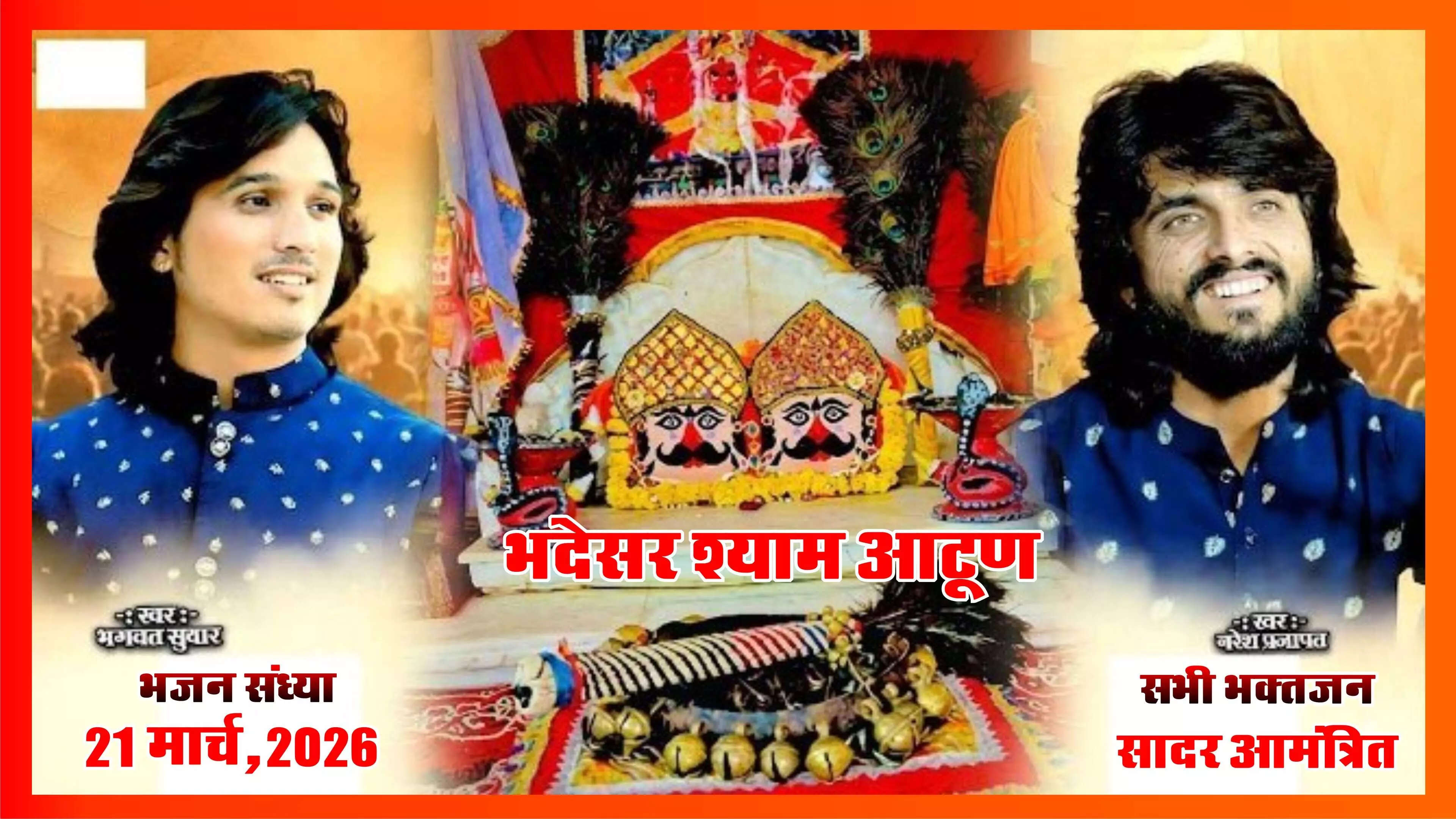 भजन संध्या में देश-दुनिया में अपनी विशेष पहचान बना चुके प्रसिद्ध भजन गायक भगवत सुथार और नरेश प्रजापत अपनी सुरीली आवाज में भजनों की प्रस्तुतियां देंगे। इनके भजनों पर श्रोताओं को झुमाने के लिए विशेष डांसर्स की टीमें भी बुलाई गई हैं, जो अपनी कला का प्रदर्शन करेंगे। आयोजन समिति द्वारा कार्यक्रम की तैयारियों को अंतिम रूप दिया जा रहा है।