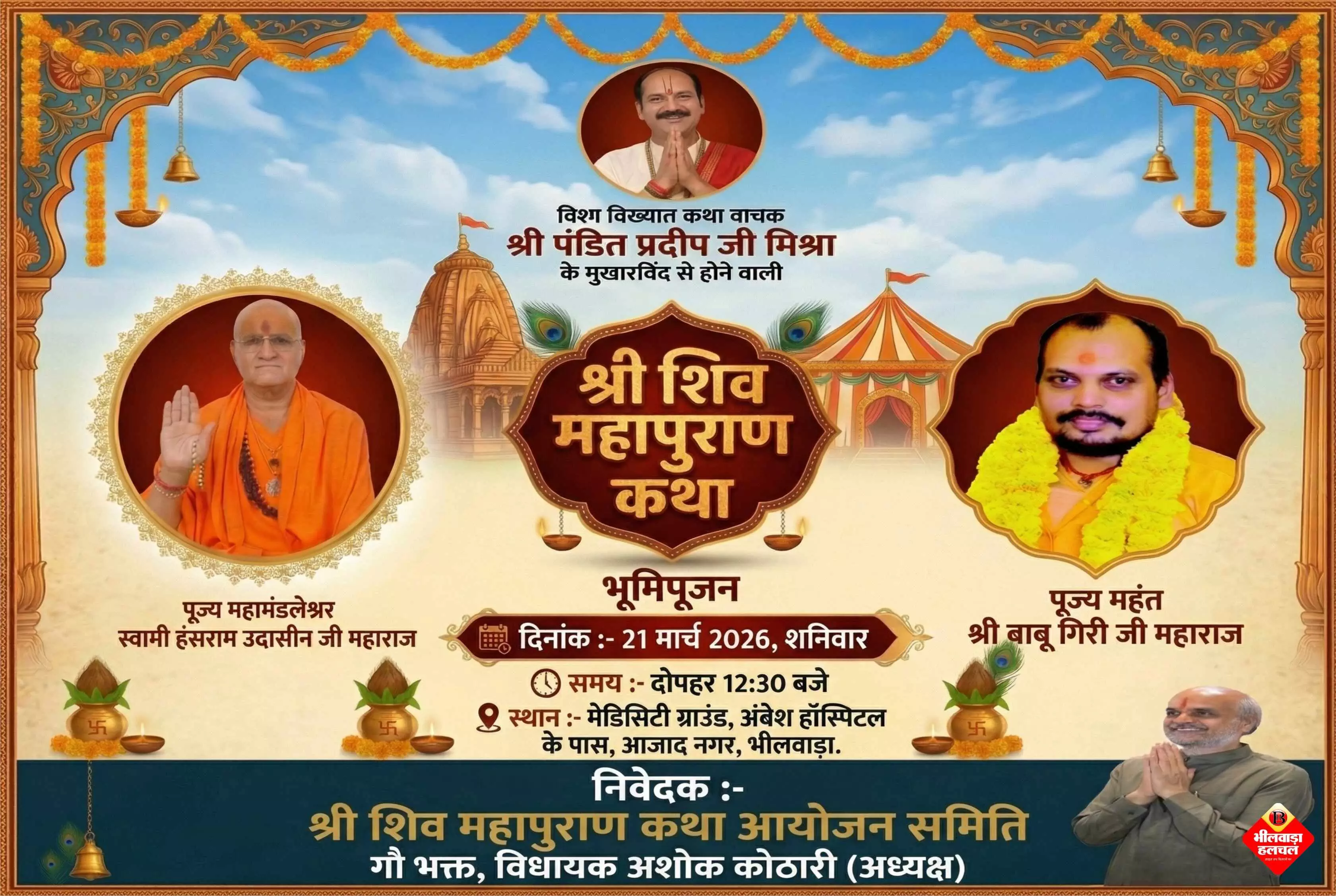 भीलवाड़ा । वस्त्र नगरी भीलवाड़ा में विश्व विख्यात कथा वाचक पंडित प्रदीप मिश्रा के मुखारविंद से आयोजित होने वाली आगामी 'श्री शिव महापुराण कथा' की तैयारियां जोर-शोर से शुरू हो गई हैं। इसी भव्य आयोजन के श्रीगणेश हेतु शनिवार, 21 मार्च 2026 को विशेष धार्मिक अनुष्ठान संपन्न किए जाएंगे।