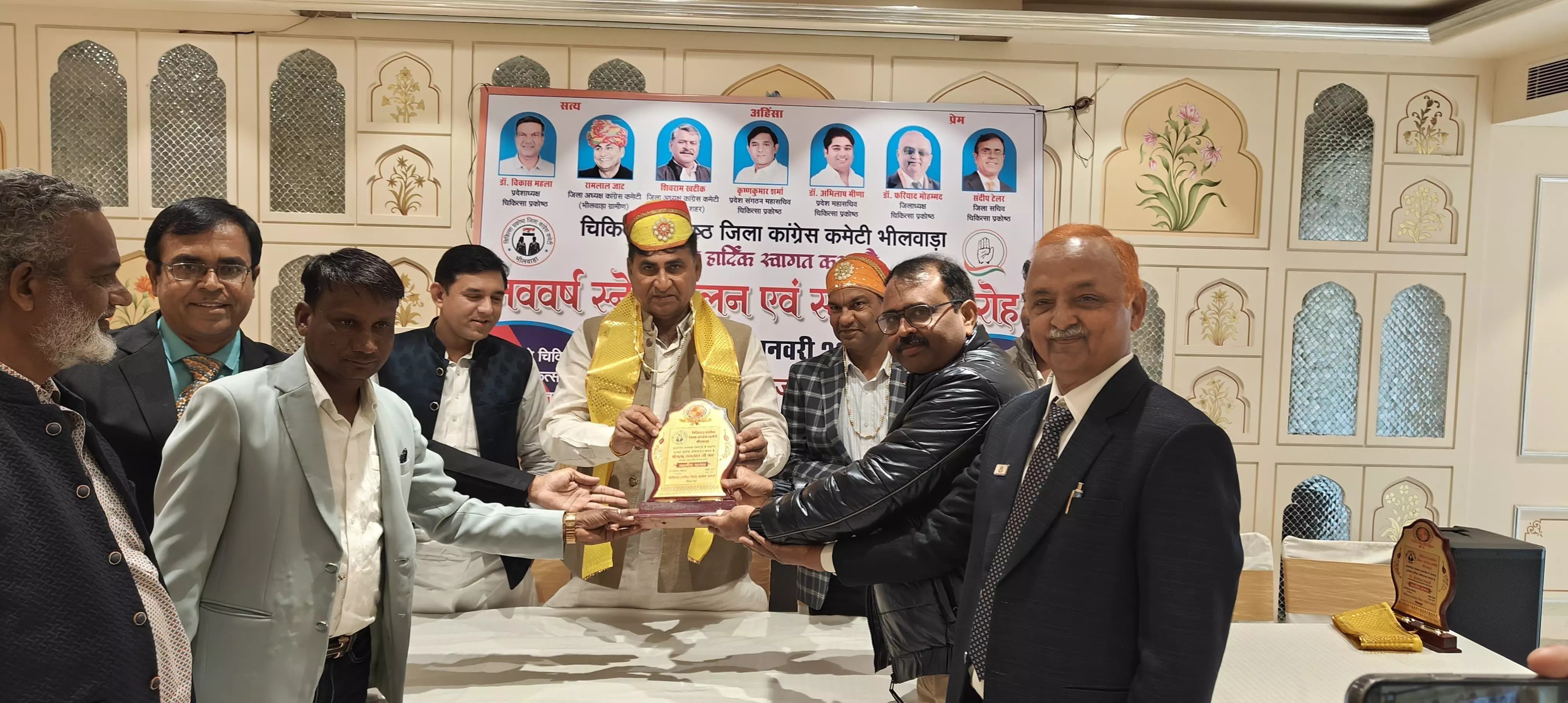 भीलवाड़ा। चिकित्सा प्रकोष्ठ जिला कांग्रेस कमेटी द्वारा डॉक्टरों और चिकित्साकर्मियों के सम्मान में 'नववर्ष स्नेह मिलन एवं सम्मान समारोह' का आयोजन किया गया। रणबांका हेरिटेज रिसॉर्ट में आयोजित इस समारोह में मुख्य अतिथि के रूप में प्रदेशाध्यक्ष डॉ. विकास महला उपस्थित रहे। कार्यक्रम की अध्यक्षता जिलाध्यक्ष डॉ. फरियाद मोहम्मद ने की।