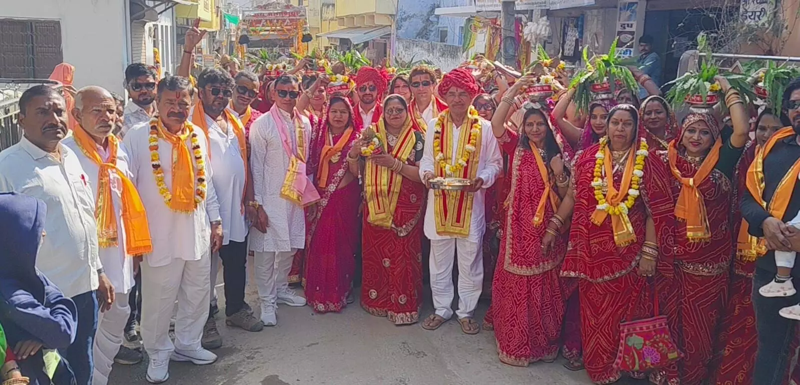 गंगापुर (दिनेश लक्षकार)|माली मोहल्ला मेलोनी शिव मंदिर में शिव परिवार की प्राण प्रतिष्ठा महोत्सव का आयोजन किया जा रहा है। जिसके तहत भव्य कलश यात्रा निकाली गई। आयोजक जगदीश माली ने बताया कि शोभायात्रा पंचतीर्थ बालाजी से प्रारंभ हुई नगर के मुख्य मार्गो से होती हुई पुनः मेलोनी माली मोहल्ला मंदिर पर पहुंची। शोभायात्रा में महिलाएं नाचती गाती चल रही थी। भगवा पताका लिए लोग भगवान शंकर के जयकारे लगा रहे थे। दिनांक 21 जनवरी को सुंदरकांड का आयोजन और दिनांक 23 जनवरी शुक्रवार को मूर्ति प्राण प्रतिष्ठा महोत्सव और पूर्णाहुति का आयोजन रहेगा। शोभायात्रा में गोवर्धन लाल माली, सुखदेव गहलोत, गोविन्द कुमार,गजेंद्र माली,धर्मेंद्र गहलोत, घनश्याम माली,परशुराम माली सहित अनेक भक्तगण और महिलाएं उपस्थित रही।