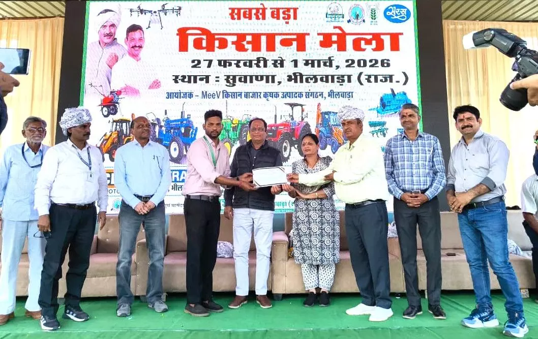 भीलवाड़ा | कृषि विज्ञान केन्द्र भीलवाड़ा के तकनीकी सहयोग से मीव किसान बाजार कृषक उत्पादक संगठन (FPO) द्वारा सुवाणा के खेल मैदान में जिले के सबसे बड़े किसान मेले का भव्य शुभारम्भ किया गया। 27 फरवरी से 1 मार्च तक चलने वाले इस मेले में उन्नत कृषि यंत्रों, ड्रोन तकनीक और आधुनिक खेती के गुर सिखाए जा रहे हैं।