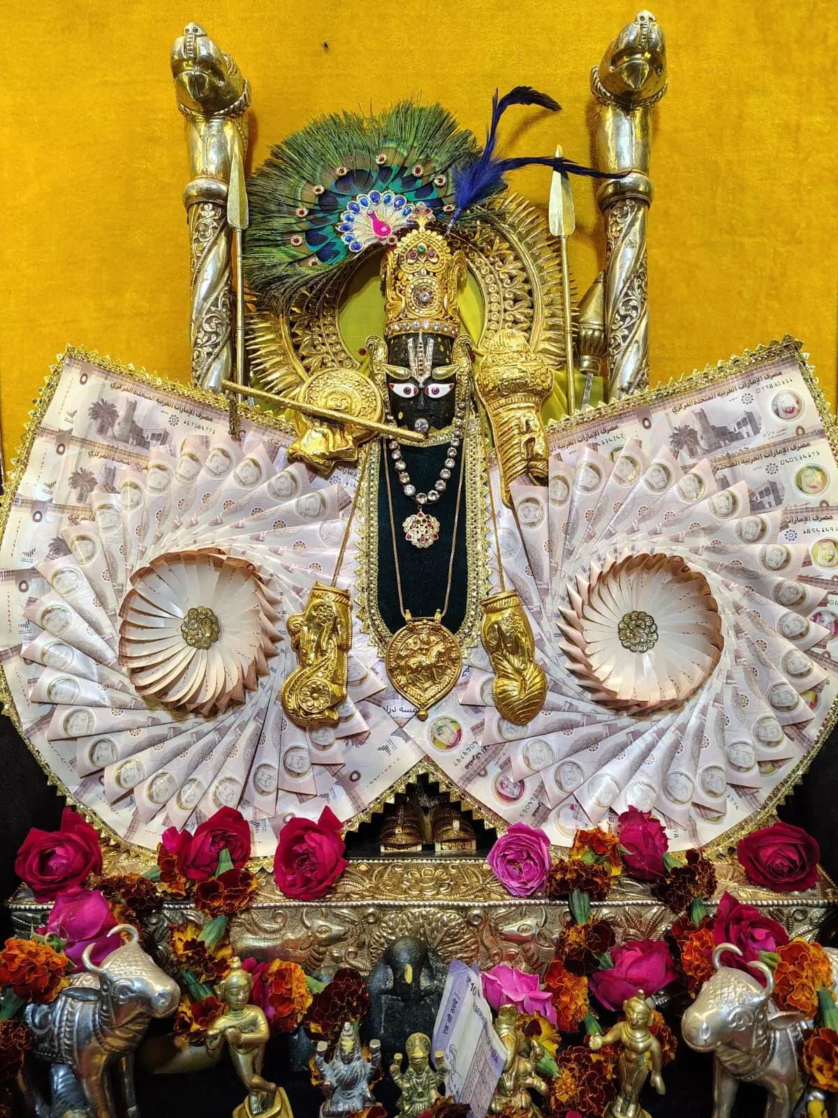 विदेशी मुद्रा से निर्मित यह अनूठा श्रंगार मंदिर परिसर का मुख्य आकर्षण बना रहा और दर्शनार्थियों ने इसे बड़े उत्साह के साथ देखा।