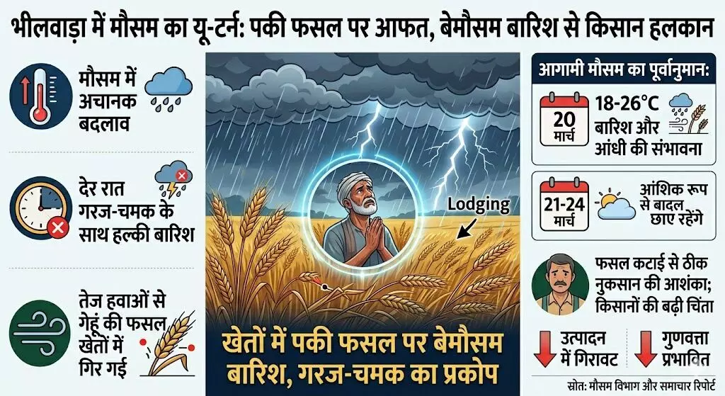 मौसम विभाग की चेतावनी के अनुरूप, बुधवार देर रात भीलवाड़ा में अचानक तेज गरज-चमक के साथ हल्की बारिश शुरू हो गई। इस आंधी-बारिश का सबसे घातक प्रहार खेतों में लहलहाती पकी फसलों पर हुआ।