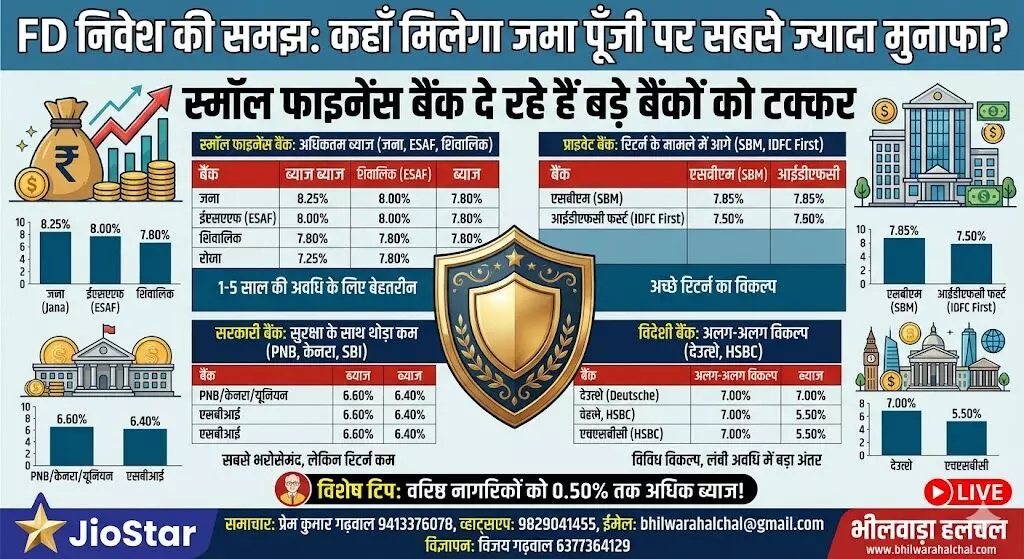 आज के दौर में सिर्फ पैसे बचाना ही काफी नहीं है, बल्कि उन्हें सही जगह निवेश करना और भी ज्यादा महत्वपूर्ण है। भारत में सुरक्षित निवेश के लिए आज भी फिक्स्ड डिपॉजिट (FD) को सबसे भरोसेमंद विकल्प माना जाता है। लेकिन, एक छोटी सी समझदारी आपके मुनाफे को काफी बढ़ा सकती है। वर्तमान में स्मॉल फाइनेंस बैंक, बड़े सरकारी और प्राइवेट बैंकों की तुलना में कहीं अधिक ब्याज ऑफर कर रहे हैं।यहाँ विभिन्न बैंकों की ब्याज दरों का तुलनात्मक विश्लेषण दिया गया है, जो आपको सही चुनाव करने में मदद करेगा:ब्याज दरों का गणित: कहाँ है सबसे ज्यादा फायदा?नीचे दी गई तालिका से समझें कि कौन सा बैंक 1 से 5 साल की अवधि के लिए कितना ब्याज दे रहा है:बैंक की श्रेणीबैंक का नामअधिकतम ब्याज दर (सालाना)स्मॉल फाइनेंस बैंकजना स्मॉल फाइनेंस बैंक8.25%ईएसएएफ (ESAF) बैंक8.00%शिवालिक बैंक7.80%प्राइवेट बैंकएसबीएम (SBM) बैंक इंडिया7.85%आईडीएफसी फर्स्ट बैंक7.50%सरकारी बैंकपीएनबी / केनरा / यूनियन बैंक6.60%एसबीआई (SBI)6.40%विदेशी बैंकदेउत्शे (Deutsche) बैंक7.00%एचएसबीसी (HSBC) बैंक5.50%स्मॉल फाइनेंस बैंक क्यों हैं आगे?निवेश के मामले में स्मॉल फाइनेंस बैंक फिलहाल सबसे आकर्षक रिटर्न दे रहे हैं। 8.25% तक का ब्याज दर कई बड़े सरकारी बैंकों (जैसे SBI के 6.40%) के मुकाबले लगभग 2% अधिक है। लंबी अवधि के निवेश में यह 1-2% का अंतर आपकी मैच्योरिटी राशि पर बहुत बड़ा सकारात्मक असर डालता है।सरकारी और विदेशी बैंकों का हालजहाँ सरकारी बैंक सुरक्षा के लिहाज से पहली पसंद होते हैं, वहीं रिटर्न के मामले में ये फिलहाल 6.40% से 6.60% के बीच ही टिके हुए हैं। विदेशी बैंकों में 'देउत्शे बैंक' 7% के साथ एक अच्छा विकल्प हो सकता है, जबकि एचएसबीसी जैसे बैंक सबसे कम 5.50% ब्याज दे रहे हैं।विशेष टिप: निवेश करने से पहले संबंधित बैंक की नियम व शर्तों और वरिष्ठ नागरिकों (Senior Citizens) को मिलने वाले अतिरिक्त ब्याज (आमतौर पर 0.50% अधिक) की जानकारी जरूर लें।
