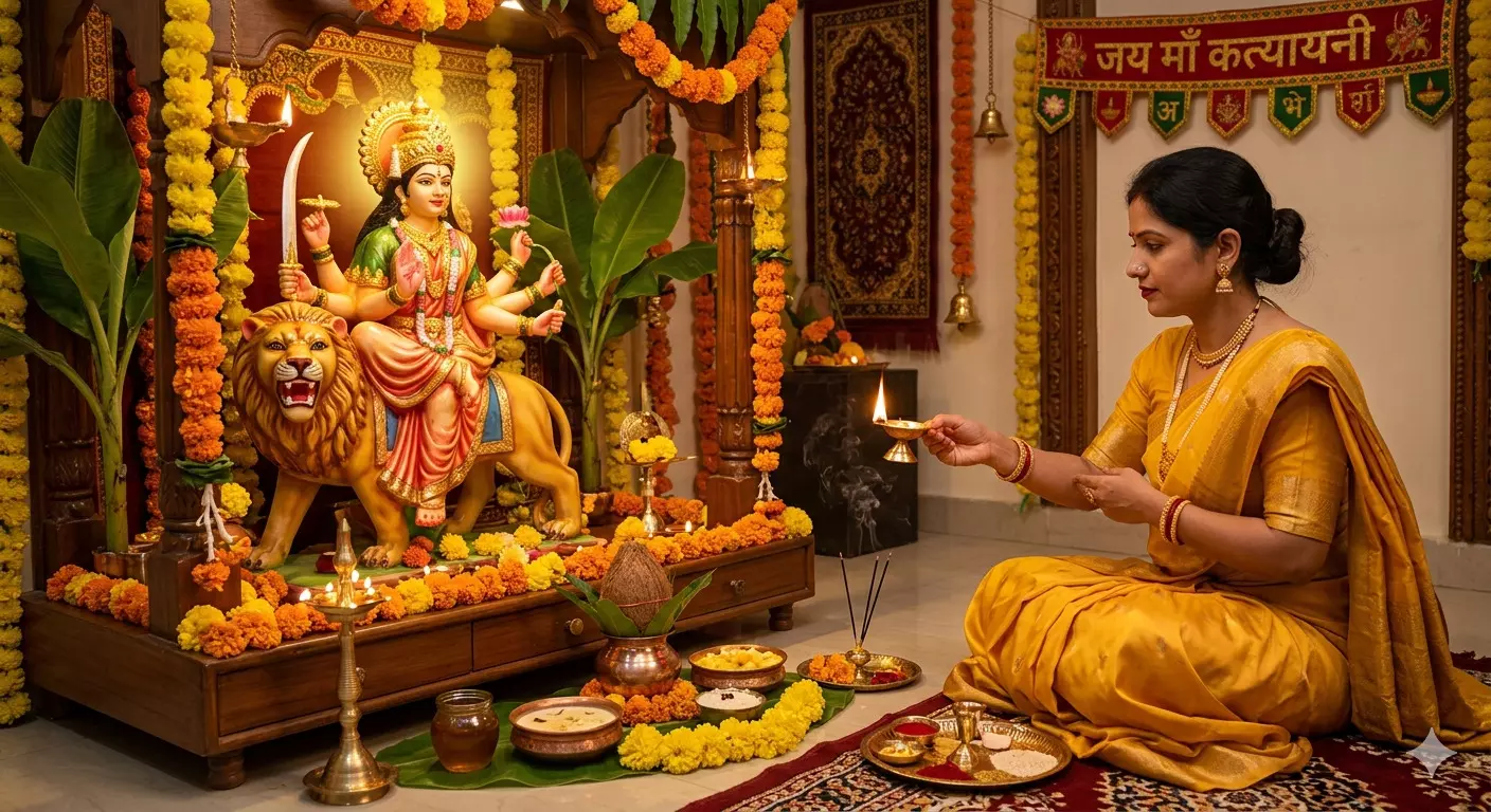 आज के दिन साधक सुबह जल्दी स्नान कर स्वच्छ वस्त्र धारण करते हैं। पूजा स्थल को गंगाजल से शुद्ध कर मां की प्रतिमा के समक्ष घी का दीपक जलाया जाता है। मां को रोली, अक्षत और विशेष रूप से पीले पुष्प अर्पित किए जाते हैं क्योंकि पीला रंग माता को अत्यंत प्रिय है। प्रसाद के रूप में मां कात्यायनी को शहद या शहद से बनी खीर का भोग लगाया जाता है।