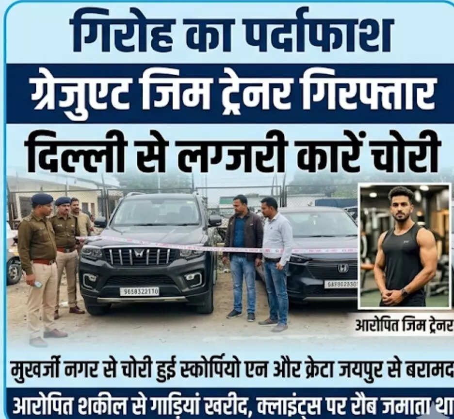 जयपुर/दिल्ली। क्राइम ब्रांच की टीम ने दिल्ली-एनसीआर से महंगी गाड़ियां चोरी कर बेचने वाले एक अंतरराज्यीय गिरोह का भंडाफोड़ करते हुए जयपुर से एक ग्रेजुएट जिम ट्रेनर को गिरफ्तार किया है। आरोपित अपने जिम क्लाइंट्स पर रौब जमाने और उन्हें सस्ते दाम पर लग्जरी कारें दिलाने का झांसा देकर चोरी के वाहन खपाने का काम कर रहा था।