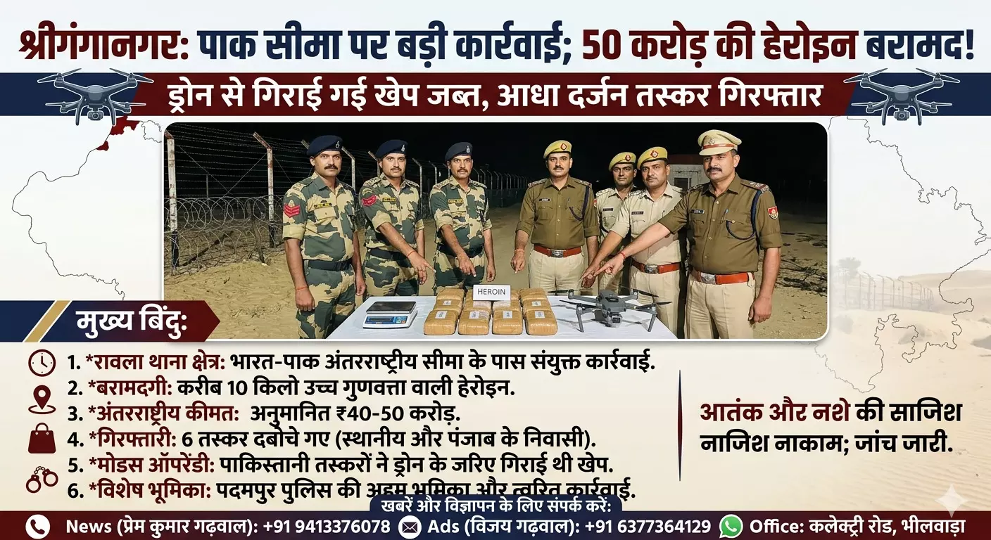 श्रीगंगानगर: भारत-पाक सीमा पर बीएसएफ और पुलिस की बड़ी कार्रवाई, ड्रोन से गिराई 50 करोड़ की हेरोइन जब्त