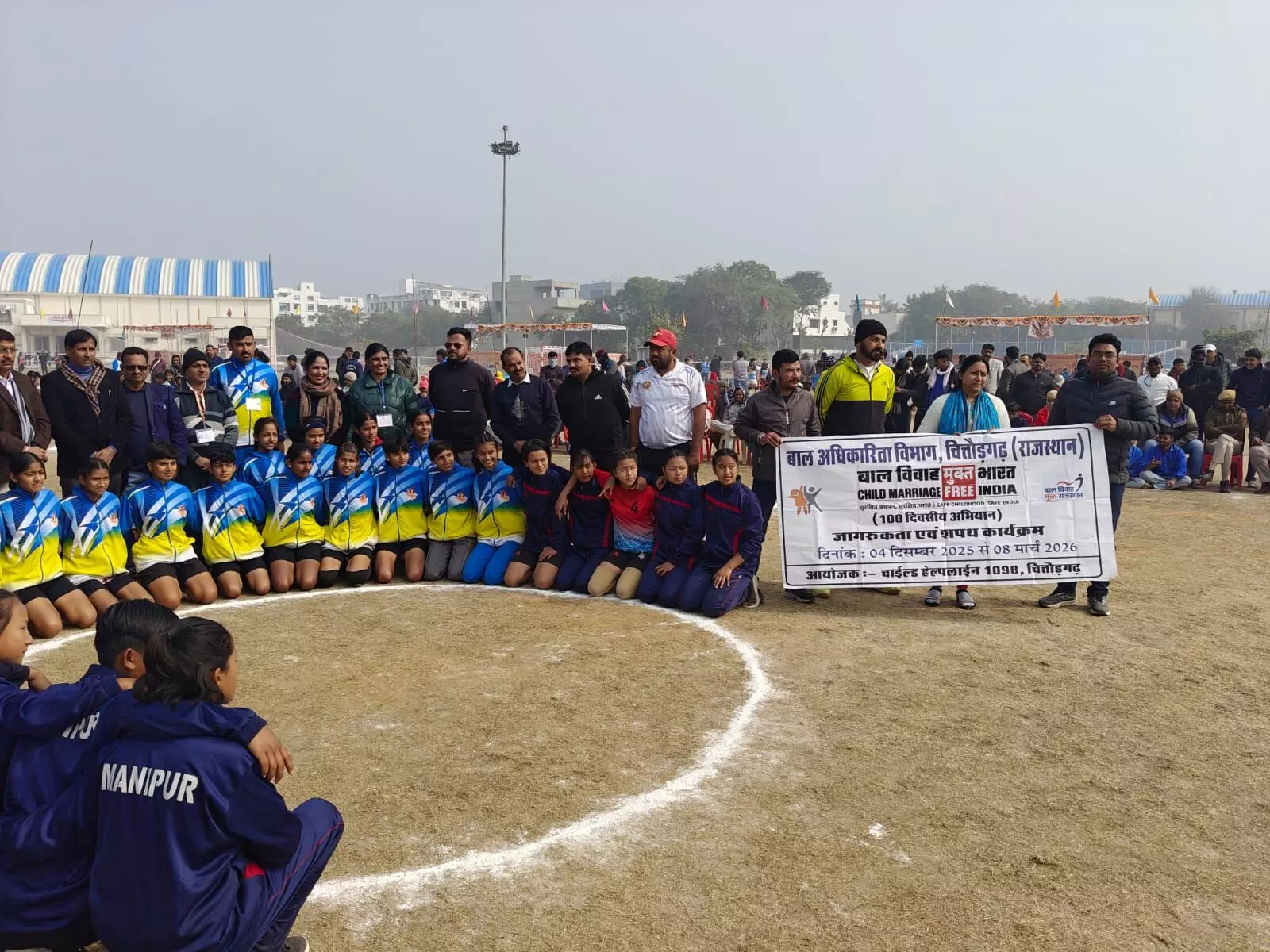 चित्तौड़गढ़ । बाल विवाह मुक्त भारत के 100 दिवसीय विशेष जागरूकता अभियान के अंतर्गत इंदिरा गांधी स्टेडियम में आयोजित नेशनल हैंडबॉल प्रतियोगिता के दौरान खिलाड़ियों एवं दर्शकों को बाल विवाह के विरुद्ध जागरूक किया गया तथा बाल विवाह निषेध की शपथ दिलाई गई।