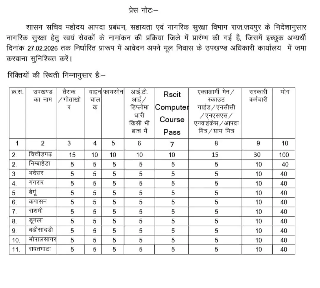 चित्तौड़गढ़,। जिले में नागरिक सुरक्षा हेतु स्वयंसेवकों के नामांकन की प्रक्रिया प्रारम्भ कर दी गई है। इच्छुक अभ्यर्थी 27 फरवरी 2026 तक निर्धारित प्रारूप में आवेदन पत्र अपने मूल निवास के उपखण्ड अधिकारी कार्यालय में जमा करवा सकते हैं।