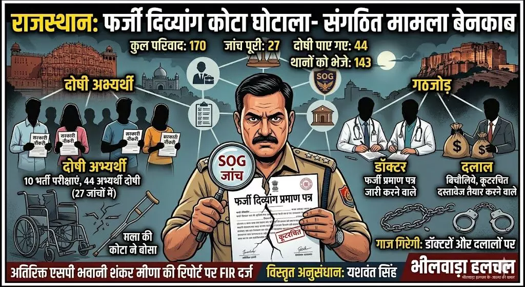 जयपुर। राजस्थान में सरकारी नौकरियों में दिव्यांग आरक्षण कोटे के संगठित दुरुपयोग का एक बड़ा और चौंकाने वाला मामला सामने आया है। स्पेशल ऑपरेशन्स ग्रुप (SOG) की जांच में यह खुलासा हुआ है कि बड़ी संख्या में अभ्यर्थियों ने फर्जी दिव्यांग प्रमाण पत्र बनवाकर आरक्षण का अनुचित लाभ लिया और सरकारी सेवाओं में प्रवेश पा लिया। इस घोटाले का दायरा इतना व्यापक है कि इसमें 10 अलग-अलग भर्ती परीक्षाओं के नाम सामने आ रहे हैं।