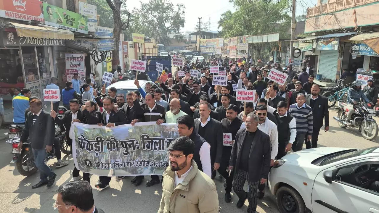 बार अध्यक्ष सीताराम कुमावत के नेतृत्व में अधिवक्ताओं ने कचहरी परिसर से डीजे के साथ रैली की शुरुआत की। रैली शहर के प्रमुख मार्गों से होती हुई उपखंड कार्यालय पहुंची। रैली के दौरान अधिवक्ताओं ने नारेबाजी कर जिला समाप्त किए जाने के निर्णय पर रोष जताया और इसे केकड़ी क्षेत्र के विकास के साथ अन्याय बताया।