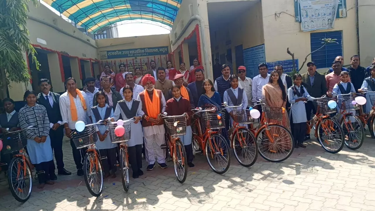 उदयपुर। राजकीय उच्च माध्यमिक विद्यालय मटून में सोमवार को कक्षा 9 में अध्ययनरत छात्राओं को निःशुल्क साइकिल वितरण योजना के अन्तर्गत सत्र 2025-26 की छात्राओं को साइकिल वितरित की गई।