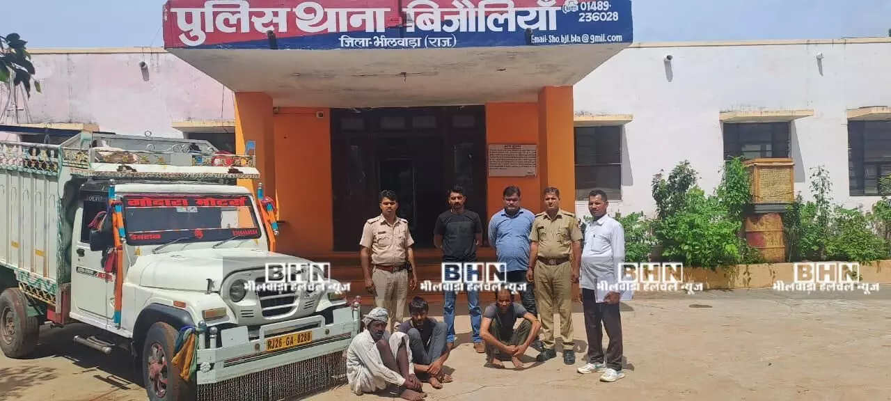 बिजौलियां पुलिस ने बताया कि 27 जून 2025 को भूति निवासी किशोर पुत्र नन्दा गुर्जर ने थाने पर रिपोर्ट पेश की कि 26 जून 2025 को उसकी 6 भैंसें नला का माताजी पेडोक्स में चरने गई थी। इनमें से दो भैंस घर आ गई, जबकि चार भैंसें चोर चुरा ले गये। इस रिपोर्ट पर पुलिस ने प्रकरण दर्ज कर जांच शुरु की। पुलिस ने वारदातस्थल का निरीक्षण किया तो पता चला कि यह भैंसें किसी लोडिंग वाहन में भर कर ले जाई गई। इस पर पुलिस ने एनएच 27 स्थित होटल-ढाबो पर लगे सीसी टीवी कैमरे चेक किये। आरोली, भोपतपुरा व धनेश्वर टोल प्लाजा पर सीसी टीवी के कैमरे चेक करने पर एक संदिग्ध पिकअप में भैंसें होने का पता चला। पुलिस ने रूट मैप तैयार किया। इस पिकअप के होडा टोल, गोपालपुरा टोल, देवली टोल, टॉक टोल, लालसोट टोल दिल्ली मुम्बई एक्सप्रेस हाईवे से होते हुए झिरका फिरोजपुर (हरियाणा) पहुंचने की जानकारी मिली। पुलिस का कहना है कि नगीना मेवात में भैंसो को बुचडखानो में काटा जाता है। इस पर नगीना मेवात शहर पहुची पुलिस टीम को उक्त संदिग्ध पिकअप मिली, जिसमें भैंसे भरी थी। पुलिस ने भैंसों को दस्तयाब कर हेमराज बागरिया, बाबुलाल बागरिया व कालु बागरिया को मौके पर ही गिरफ्तार कर लिया। पुलिस पिकअप जब्त कर उसे भैसों सहित यहां ले आई। चोरी गई चोरों भैंसों को परिवादी के सुपुर्द कर दिया गया। पकड़े गये आरोपितों में टोंक जिले के थालियों की ढाणी, पचेवर निवासी कालू 46 पुत्र देवकरण बागरिया, गुलाबपुरा थाना पचेवर टोंक निवासी बाबूलाल 39 पुत्र रंगलाल बागरिया व भोजलाई, पचेवर निवासी हेमराज 30 पुत्र छीतर बागरिया शामिल हैं। इस कार्रवाई को दीवान लक्ष्मण सिंह व कांस्टेबल मनीष चौधरी ने अंजाम दिया।