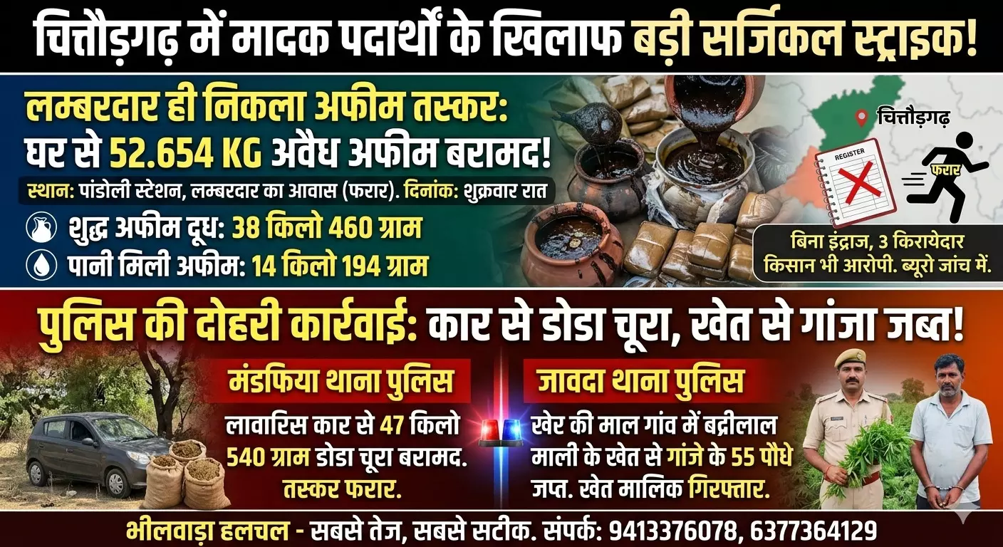 चित्तौड़गढ़। चित्तौड़गढ़ जिले में अवैध मादक पदार्थों के कारोबार पर केंद्रीय नारकोटिक्स ब्यूरो और स्थानीय पुलिस ने एक साथ बड़ी चोट की है। दो अलग-अलग कार्यवाहियों में, नारकोटिक्स ब्यूरो ने एक अफीम लम्बरदार के घर से बिना इंद्राज की भारी मात्रा में अफीम बरामद की है, जबकि चित्तौड़गढ़ पुलिस ने लावारिस कार से डोडा चूरा और एक खेत से अवैध गांजे के पौधे जब्त किए हैं।