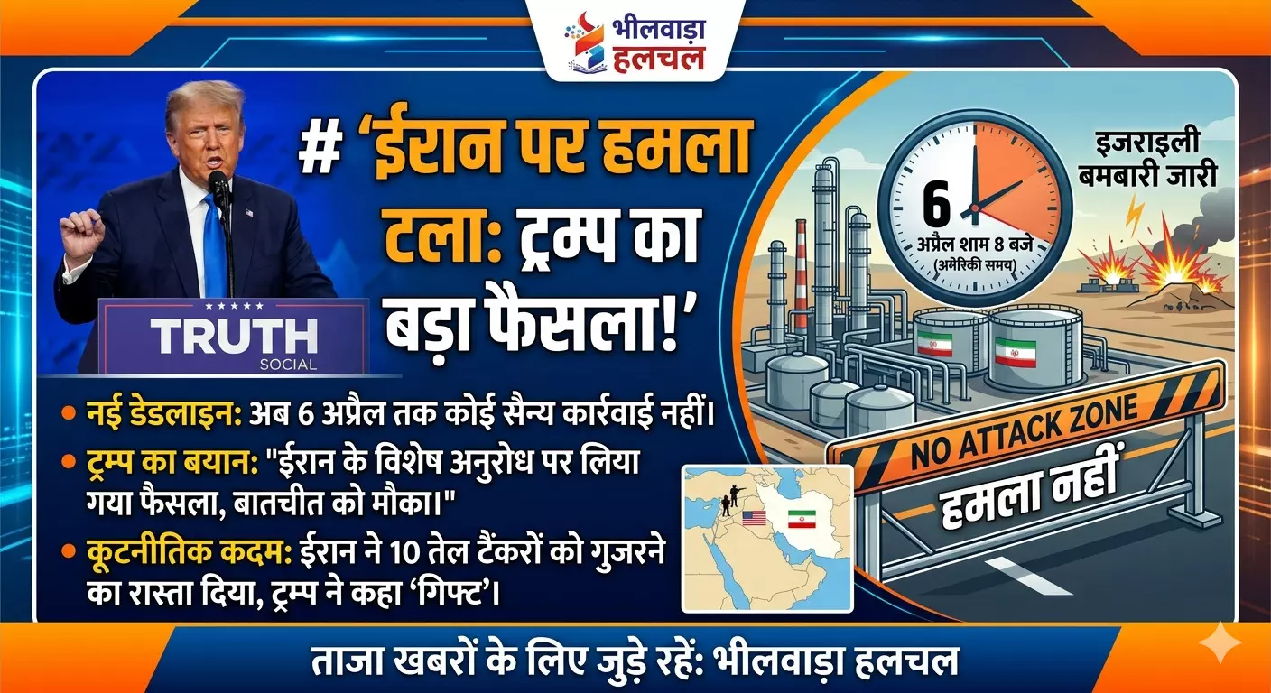 वॉशिंगटन/तेहरान: अमेरिकी राष्ट्रपति डोनाल्ड ट्रम्प ने मध्य पूर्व में जारी तनाव के बीच एक बड़ा कूटनीतिक दांव खेलते हुए ईरान के ऊर्जा ठिकानों पर हमले की डेडलाइन को 10 दिनों के लिए टाल दिया है। ट्रम्प ने 'ट्रुथ सोशल' पर जानकारी साझा करते हुए बताया कि ईरान के विशेष अनुरोध पर अब 6 अप्रैल शाम 8 बजे (अमेरिकी समयानुसार) तक कोई सैन्य कार्रवाई नहीं की जाएगी। एक हफ्ते के भीतर यह दूसरी बार है जब ट्रम्प ने हमले के फैसले को टाला है।