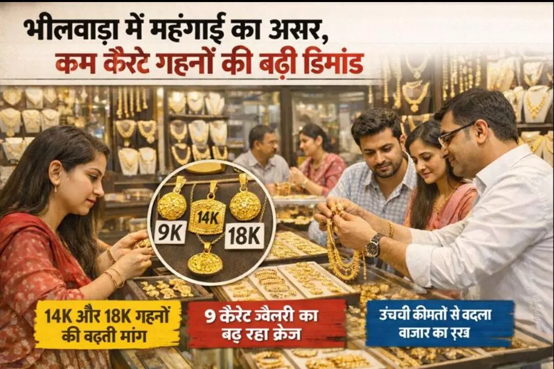 भीलवाड़ा (विजय गढ़वाल)। सोने और चांदी की कीमतों में आ रही रिकॉर्ड तोड़ तेजी ने भीलवाड़ा के सर्राफा बाजार की तस्वीर बदल दी है। आसमान छूते भावों के कारण अब आम उपभोक्ताओं के साथ-साथ व्यापारियों ने भी अपनी रणनीति बदल ली है। शहर के बाजारों में अब पहले जैसी रौनक कम ही नजर आ रही है, जिसके चलते कारोबारी अब कम कैरेट के किफायती आभूषणों पर फोकस कर रहे हैं।