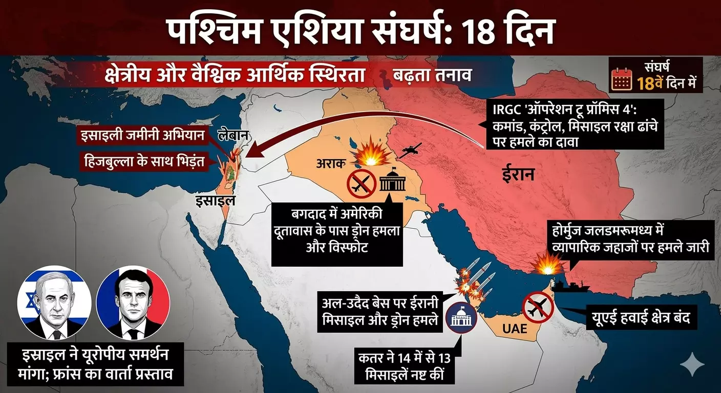 बगदाद/दुबई/यरूशलेम। पश्चिम एशिया में जारी संघर्ष अब एक विनाशकारी मोड़ ले चुका है। अमेरिका-इस्राइल बनाम ईरान के बीच छिड़ी यह जंग आज 18वें दिन में प्रवेश कर गई है। मिसाइल और ड्रोन हमलों ने न केवल क्षेत्रीय शांति को भंग किया है, बल्कि होर्मुज जलडमरूमध्य में व्यापारिक जहाजों पर हो रहे हमलों ने वैश्विक अर्थव्यवस्था की धड़कनें बढ़ा दी हैं।