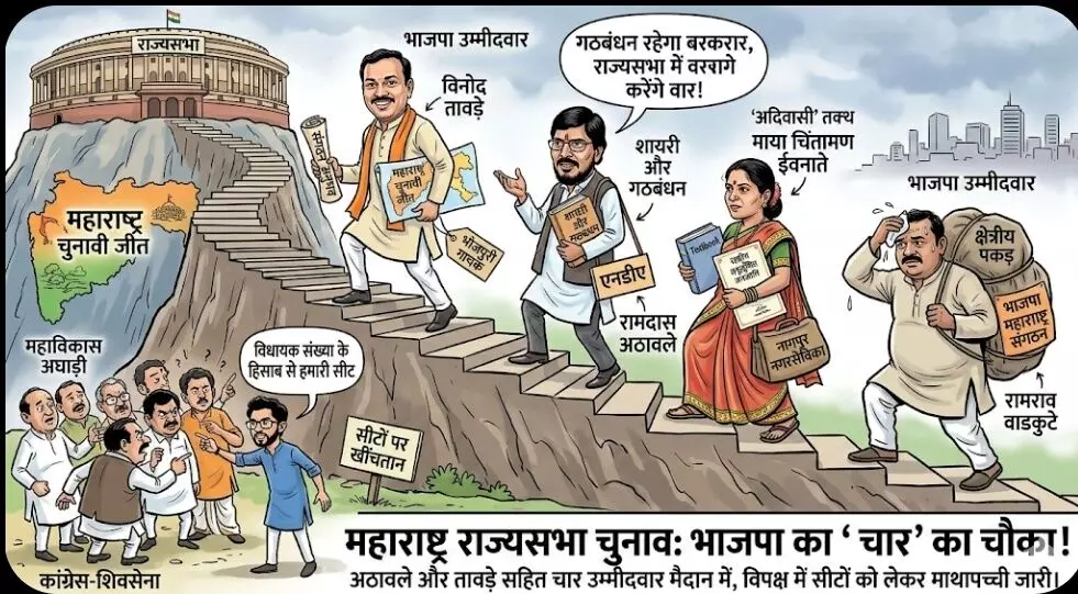 नई दिल्ली/मुंबई। भारतीय जनता पार्टी (भाजपा) ने महाराष्ट्र की सात राज्यसभा सीटों में से चार के लिए अपने उम्मीदवारों के नामों का आधिकारिक एलान कर दिया है। नई दिल्ली स्थित पार्टी के केंद्रीय कार्यालय द्वारा जारी विज्ञप्ति के अनुसार, केंद्रीय चुनाव समिति ने राज्यसभा चुनाव के लिए केंद्रीय मंत्री रामदास अठावले, भाजपा के राष्ट्रीय महासचिव विनोद तावड़े, माया चिंतामण ईवनाते और रामराव वाडकुटे की उम्मीदवारी पर मुहर लगा दी है।