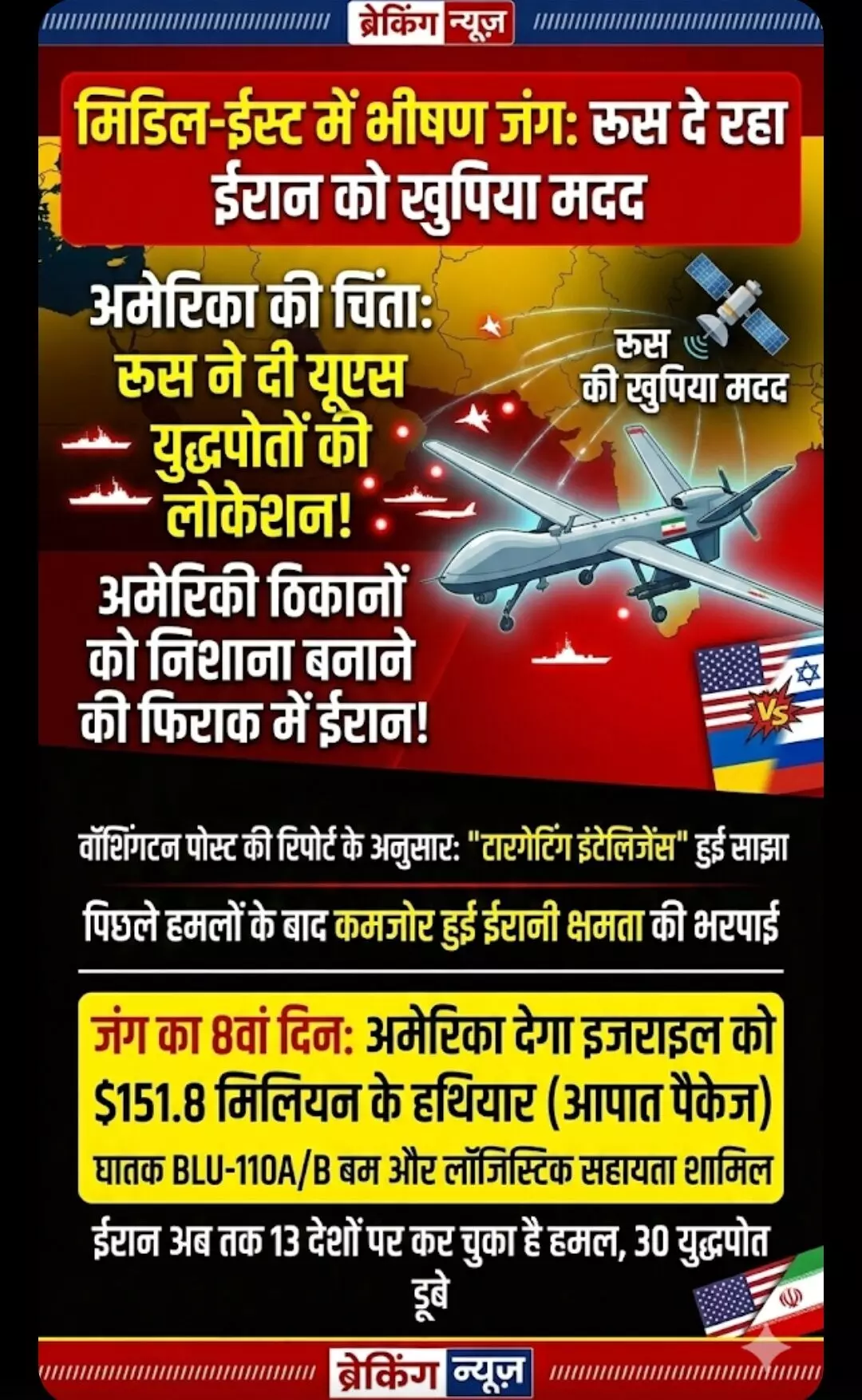 नई दिल्ली/वॉशिंगटन | मिडिल-ईस्ट में जारी भीषण युद्ध अब आठवें दिन में प्रवेश कर चुका है। इस बीच एक बेहद चौंकाने वाली खबर सामने आ रही है कि रूस, ईरान को अमेरिकी युद्धपोतों और सैन्य विमानों की सटीक लोकेशन साझा कर खुफिया मदद पहुँचा रहा है। 'वॉशिंगटन पोस्ट' की रिपोर्ट के अनुसार, रूस द्वारा दी जा रही 'टारगेटिंग इंटेलिजेंस' की मदद से ईरान अमेरिकी सैन्य ठिकानों को निशाना बनाने की फिराक में है।