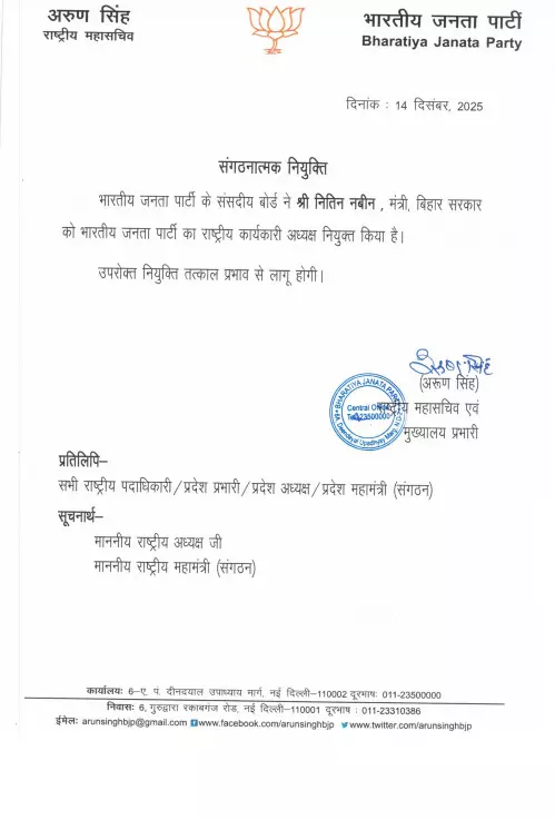 नई दिल्ली। बिहार सरकार में मंत्री नितिन नबीन को भारतीय जनता पार्टी (BJP) का राष्ट्रीय कार्यकारी अध्यक्ष नियुक्त किया गया है। वे इस पद पर जेपी नड्डा की जगह लेंगे। इस निर्णय के बाद नितिन नबीन पार्टी के राष्ट्रीय नेतृत्व में महत्वपूर्ण भूमिका निभाएंगे।