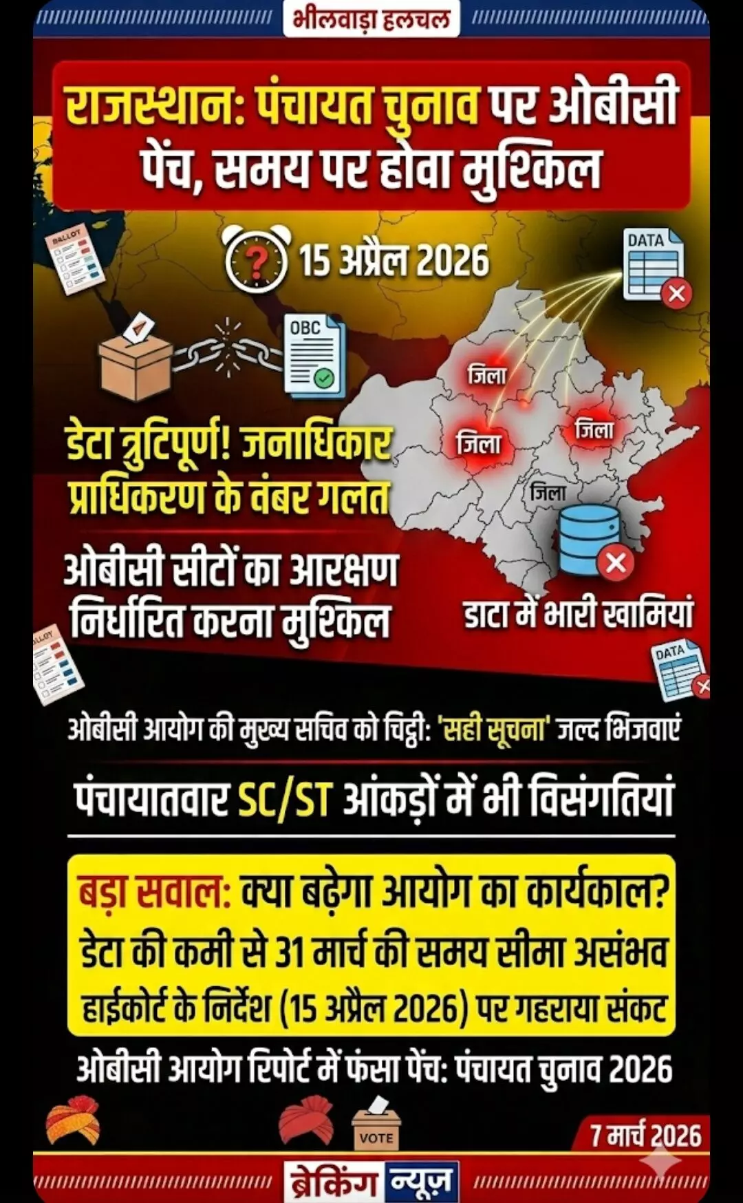 जयपुर | राजस्थान हाईकोर्ट द्वारा राज्य सरकार को 15 अप्रैल 2026 तक पंचायत चुनाव संपन्न कराने के सख्त निर्देश दिए गए थे, लेकिन अब इन चुनावों पर अनिश्चितता के बादल मंडराने लगे हैं। इसका मुख्य कारण अन्य पिछड़ा वर्ग (OBC) आयोग की रिपोर्ट में हो रही देरी और डेटा संबंधी गंभीर विसंगतियां हैं।